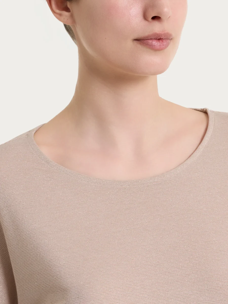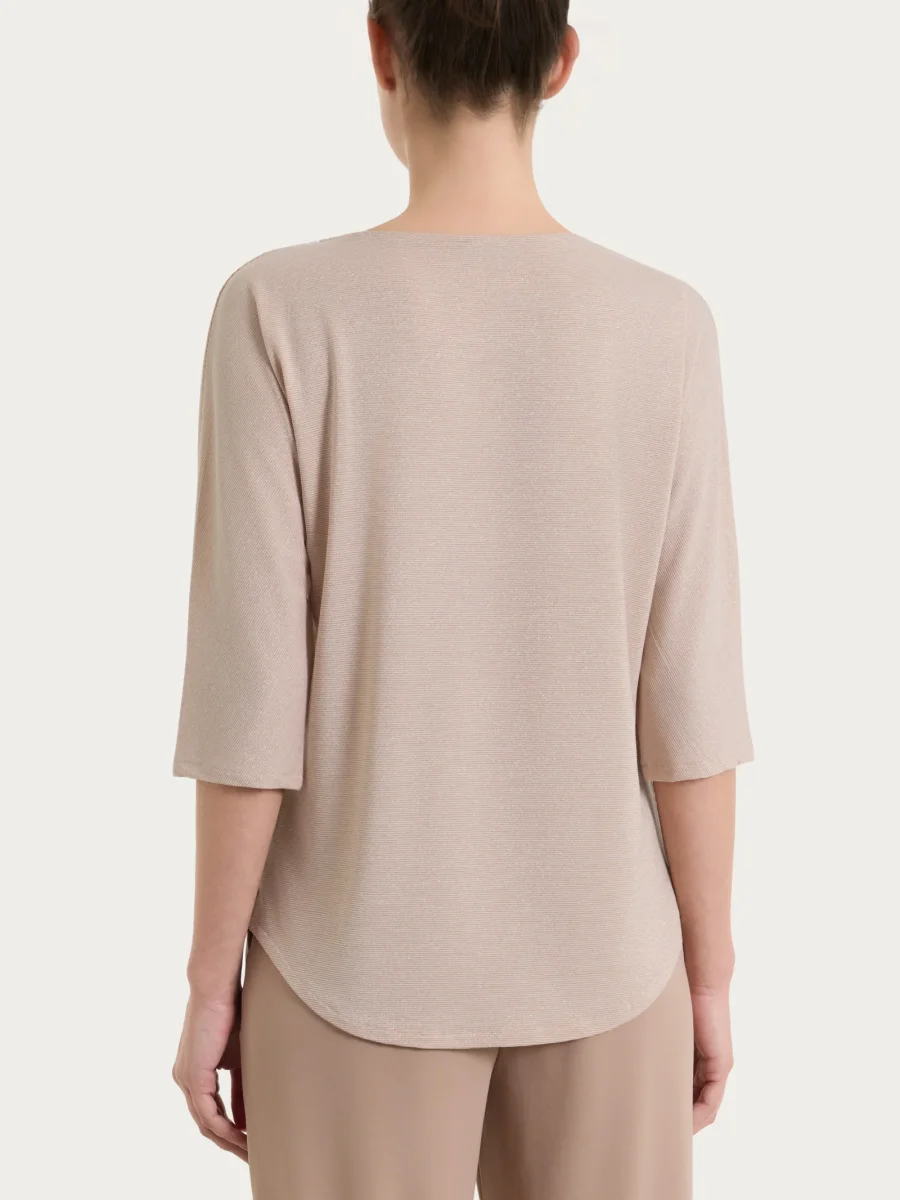 Il capo è caratterizzato dalla lavorazione tinto filo lurex, che dona una brillantezza leggera e uniforme, elegante ma perfetta anche per l’uso quotidiano. La vestibilità morbida accompagna il corpo con una caduta fluida e confortevole, assicurando libertà di movimento e una resa sempre curata.