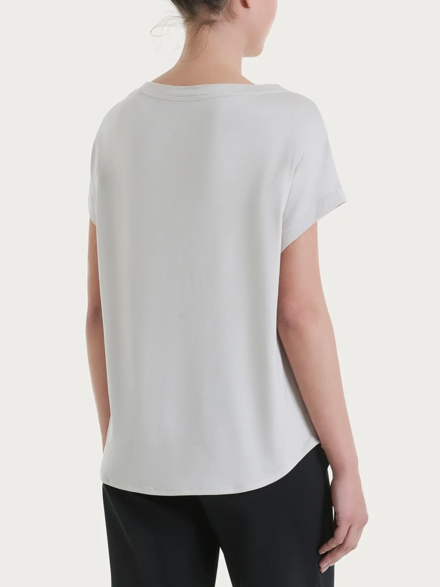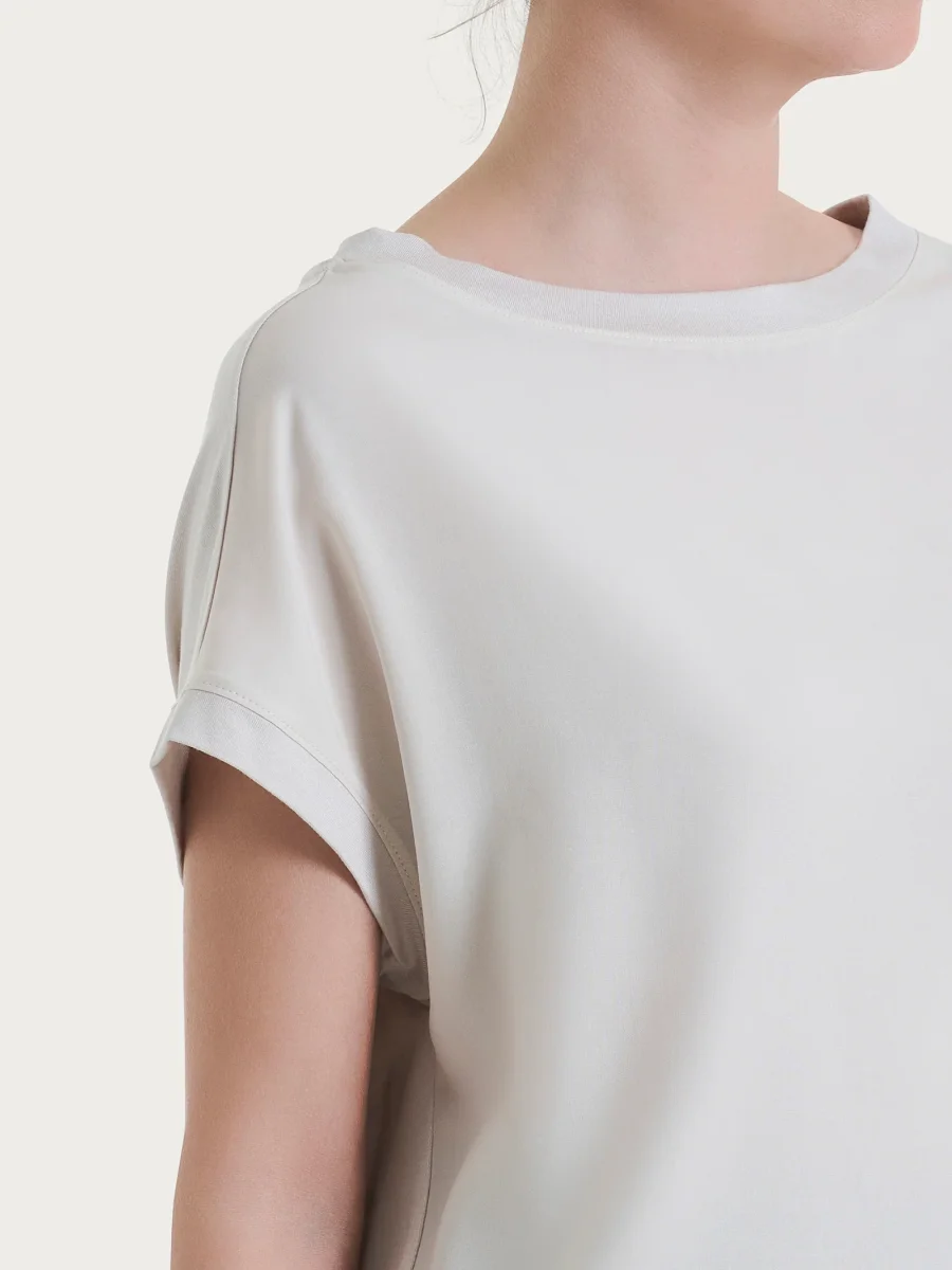 Maglietta girocollo con manica corta kimono e fondo svasato.
