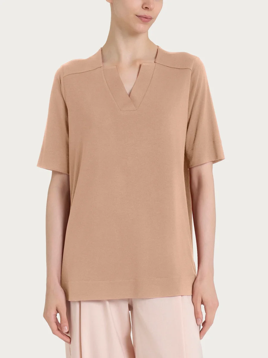 Realizzata con un tessuto di jersey in viscosa crêpe, tessuto che dona freschezza straordinaria e una caduta fluida. Ottenuto con filati ad alta torsione, che conferiscono una consistenza nervosa e increspata, bilanciata dalla delicata morbidezza della viscosa. La viscosa, essendo una fibra naturale e traspirante, rende il capo adatto a una varietà di situazioni, dalla vita quotidiana a occasioni casual all’aperto.
