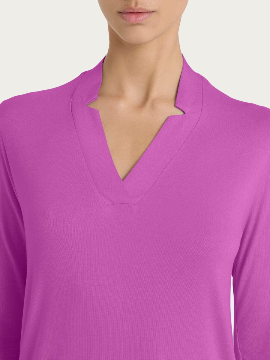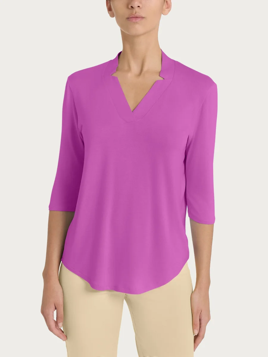 Maglietta con scollo a V con delicati spacchetti per definirne maggiormente l’apertura.
