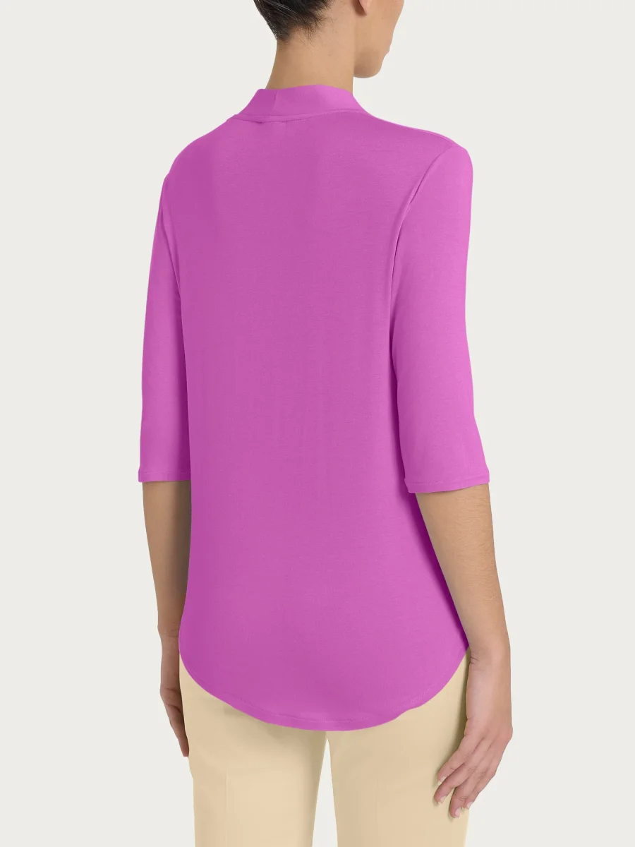Realizzata in fresco e traspirante jersey elasticizzato di viscosa, una fibra di origine cellulosica che unisce le migliori qualità della seta e del cotone. Morbida e delicata sulla pelle come la seta ma resistente e traspirante come il cotone oltre che di semplice manutenzione e comodamente lavabile in lavatrice.