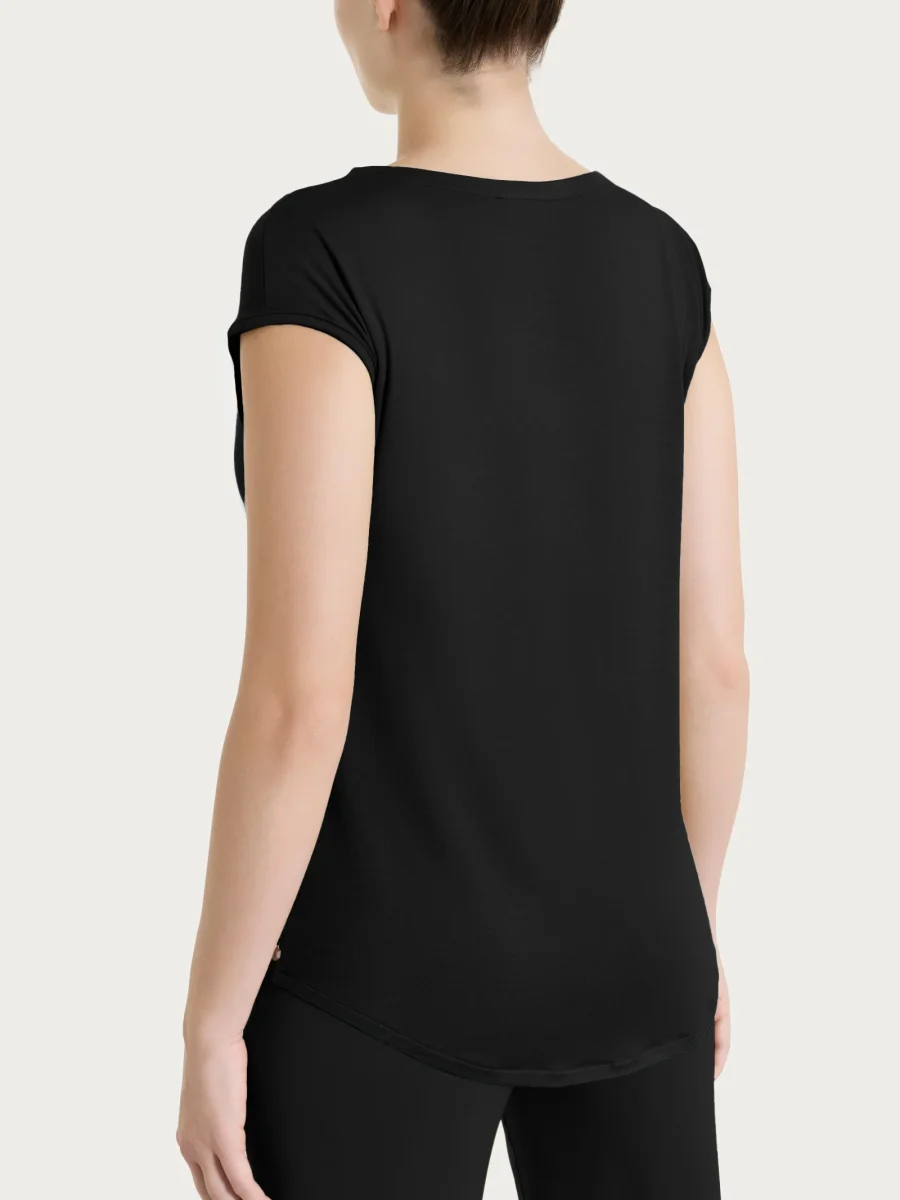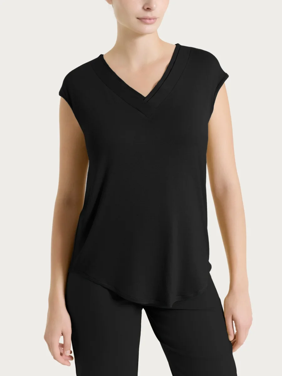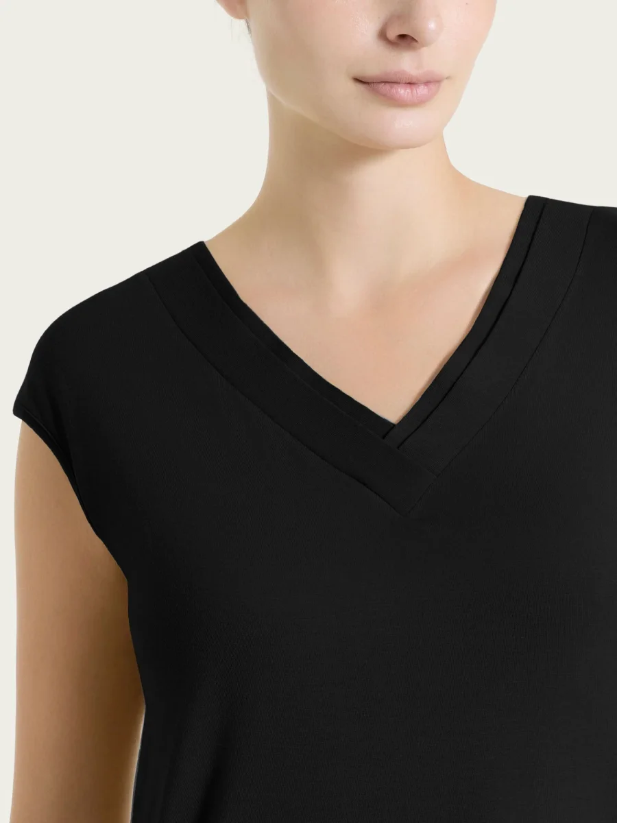 Maglietta da donna tinta unita con scollo a V incrociato, realizzata in Viscosa Summer, dal look fresco e femminile.