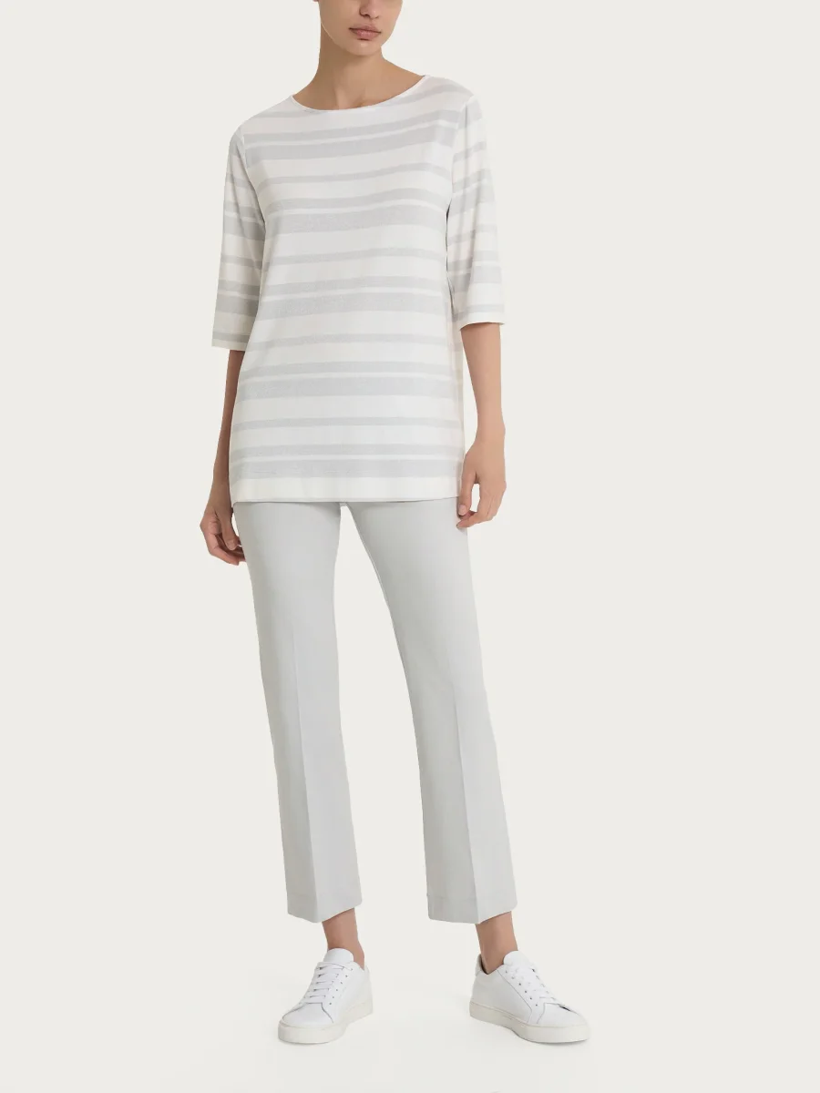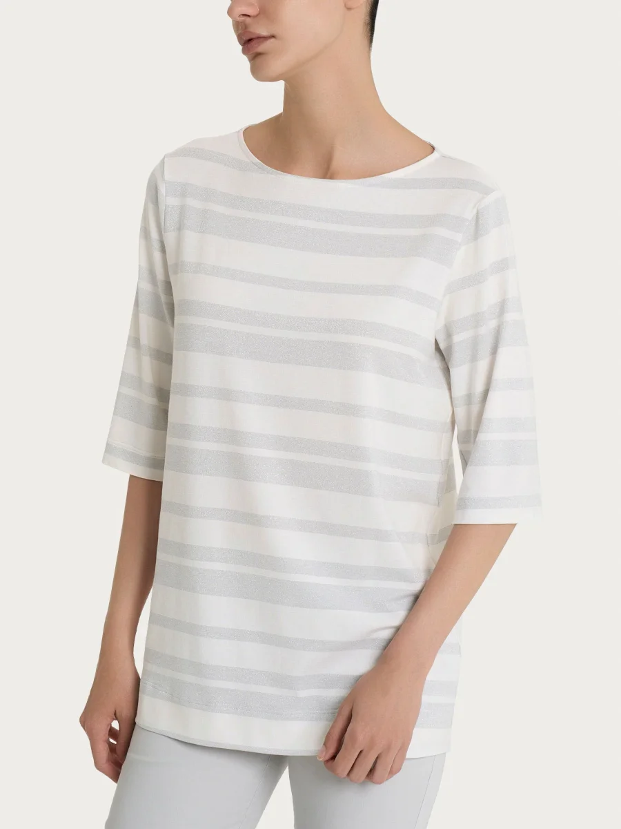 Le maniche 3/4 senza rimanere aderenti al corpo completano il design ed il dettaglio delle righe in lurex introduce una nota scintillante, rendendo la maglietta perfetta da abbinare a diversi outfit, dal casual al più chic.