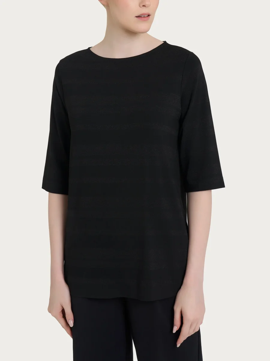 Le maniche 3/4 senza rimanere aderenti al corpo completano il design ed il dettaglio delle righe in lurex introduce una nota scintillante, rendendo la maglietta perfetta da abbinare a diversi outfit, dal casual al più chic.