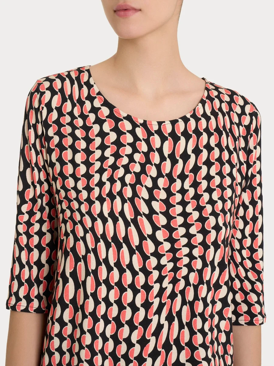 Caratterizzato da una vestibilità soft ed un tessuto in crepe, nasce da una combinazione di eleganza, comfort e praticità. Grazie al tessuto noto per la sua fluidità e leggerezza e alla vestibilità la maglia di drappeggia morbidamente sul corpo, garantendo una vestibilità confortevole e piacevole al tatto.