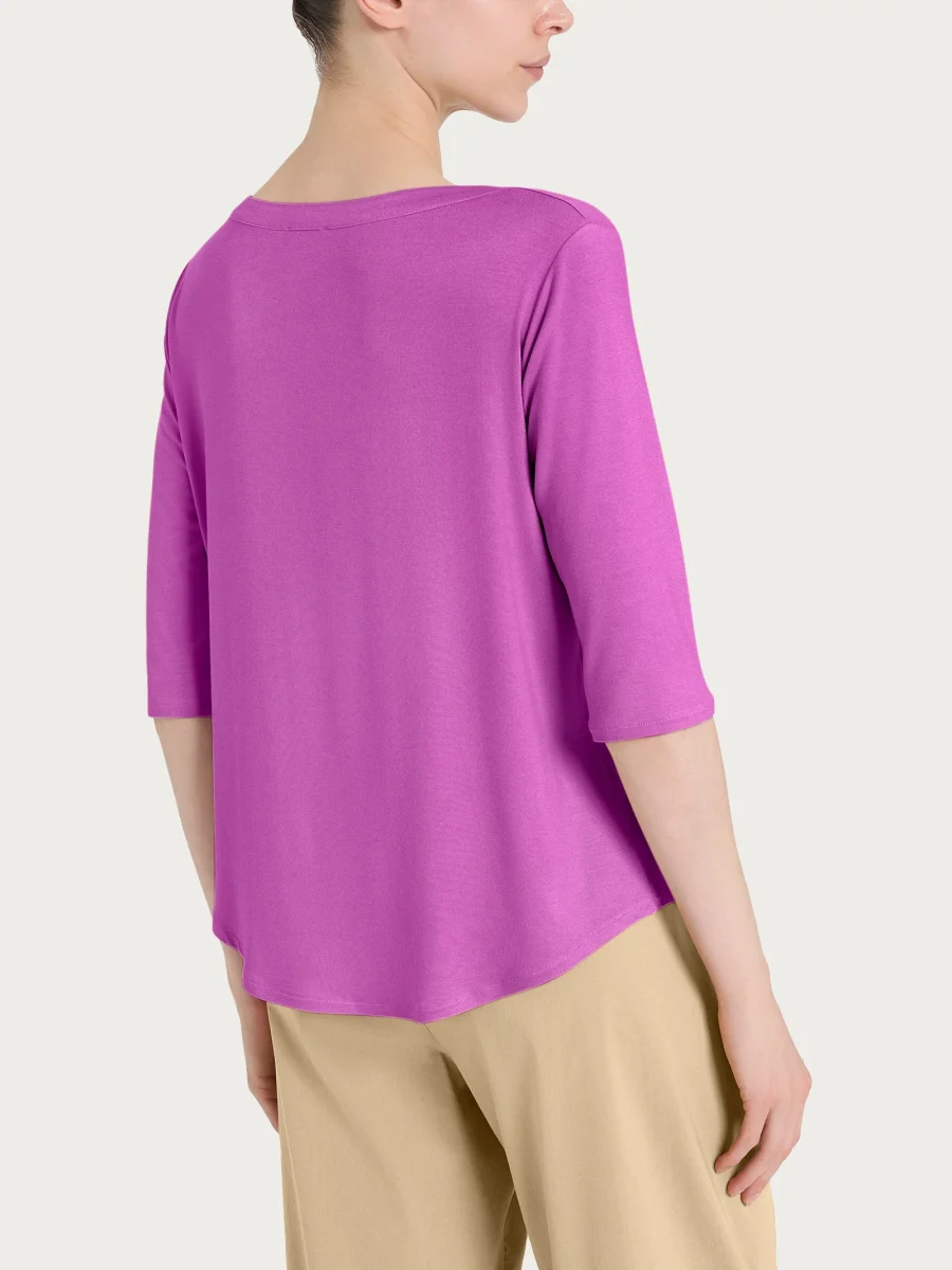 Maglietta da donna realizzata in fresco e traspirante jersey elasticizzato di viscosa, una fibra di origine cellulosica che unisce le migliori qualità della seta e del cotone. Morbida e delicata sulla pelle come la seta ma resistente e traspirante come il cotone oltre che di semplice manutenzione e comodamente lavabile in lavatrice.