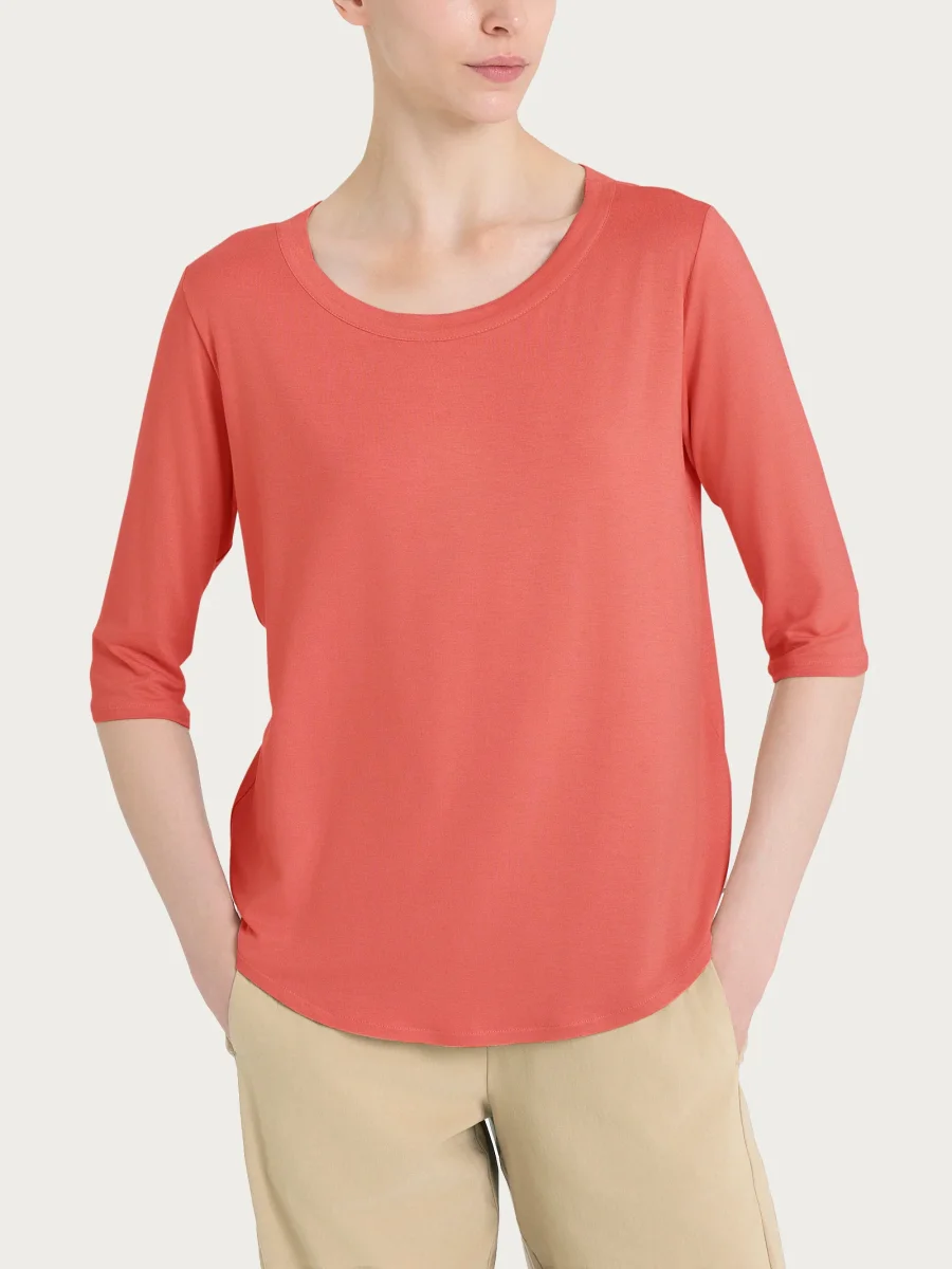 Maglietta da donna realizzata in fresco e traspirante jersey elasticizzato di viscosa, una fibra di origine cellulosica che unisce le migliori qualità della seta e del cotone. Morbida e delicata sulla pelle come la seta ma resistente e traspirante come il cotone oltre che di semplice manutenzione e comodamente lavabile in lavatrice.
