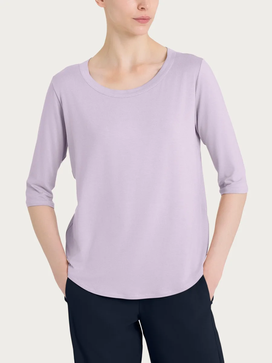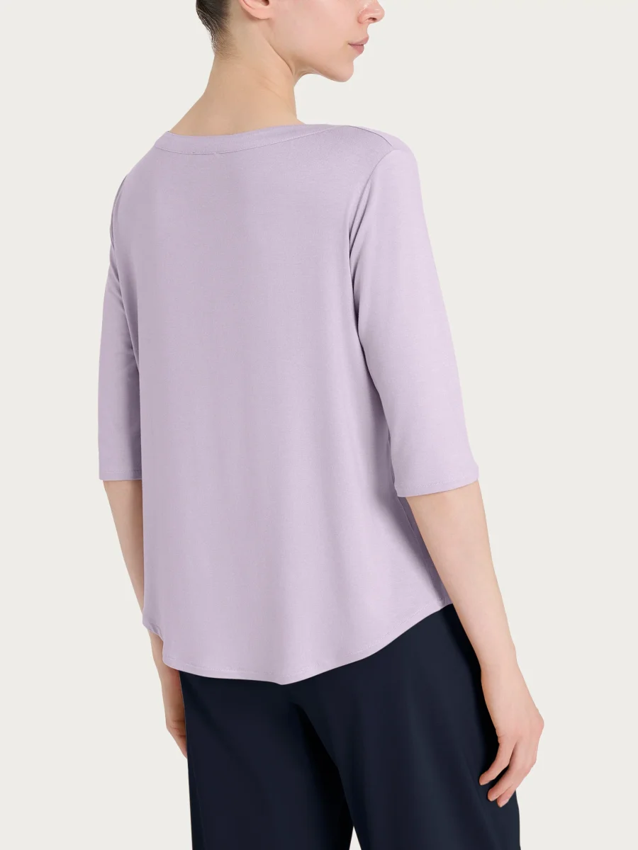 Maglietta da donna realizzata in fresco e traspirante jersey elasticizzato di viscosa, una fibra di origine cellulosica che unisce le migliori qualità della seta e del cotone. Morbida e delicata sulla pelle come la seta ma resistente e traspirante come il cotone oltre che di semplice manutenzione e comodamente lavabile in lavatrice.