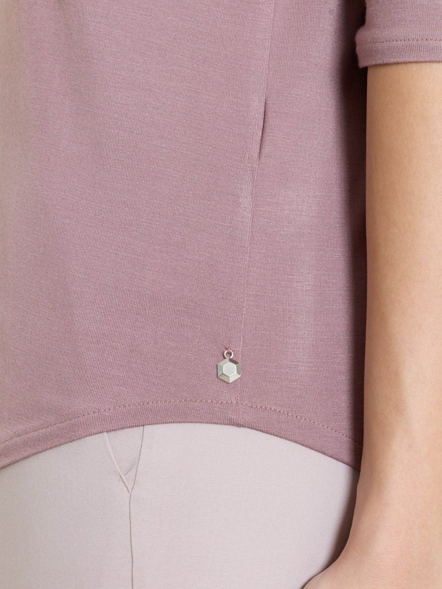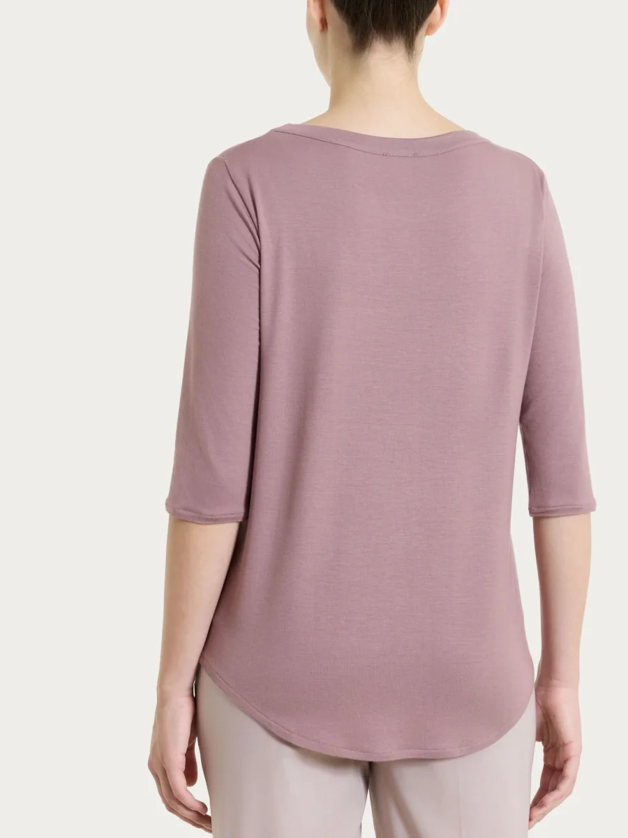 Maglietta da donna realizzata in fresco e traspirante jersey elasticizzato di viscosa, una fibra di origine cellulosica che unisce le migliori qualità della seta e del cotone. Morbida e delicata sulla pelle come la seta ma resistente e traspirante come il cotone oltre che di semplice manutenzione e comodamente lavabile in lavatrice.