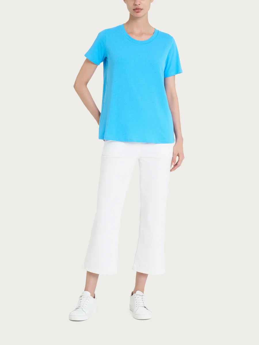 Il girocollo definisce la scollatura con una linea semplice e ordinata, mentre la manica corta rende il capo ideale per la stagione calda e per creare outfit freschi e pratici.