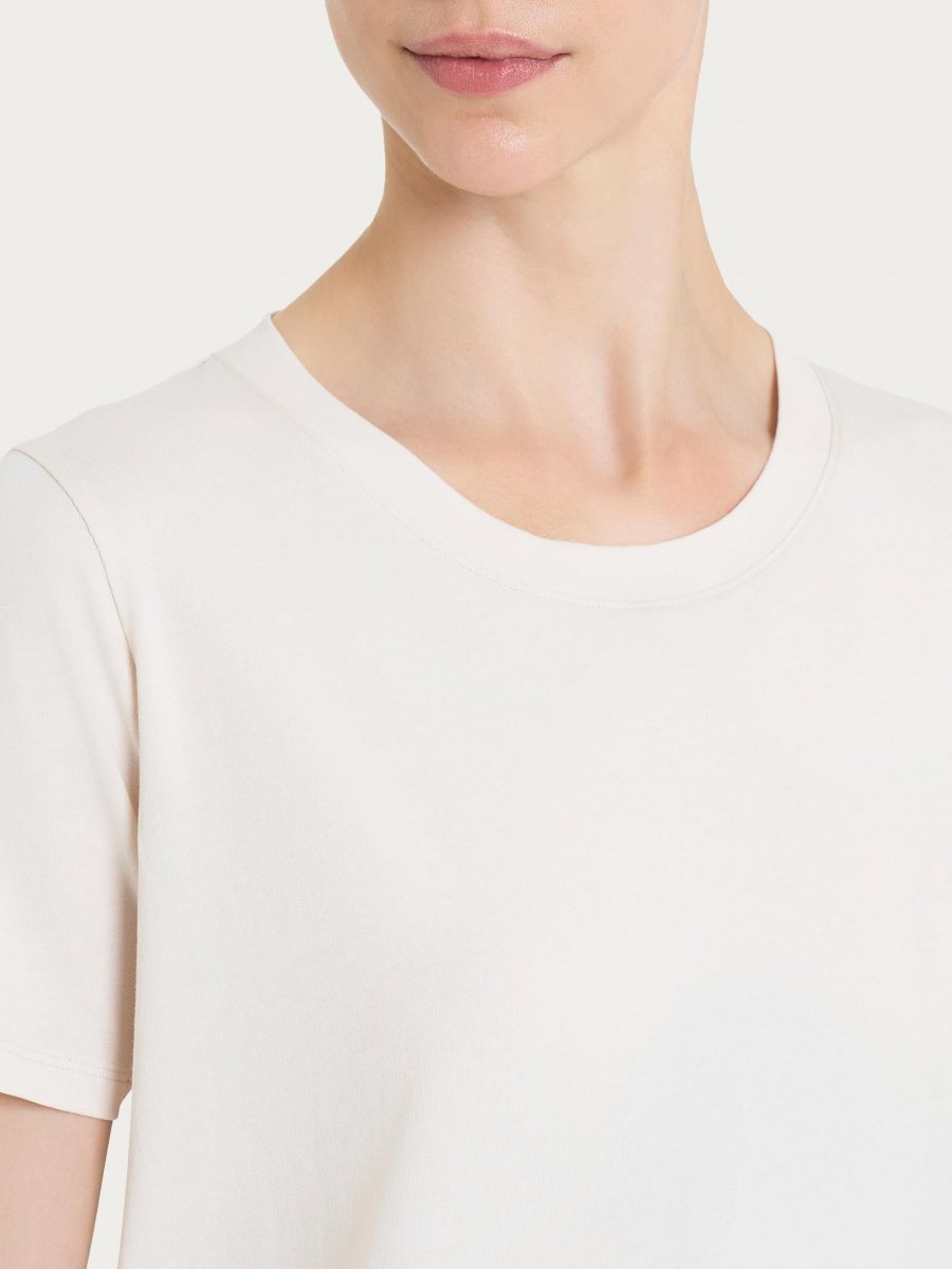 Il girocollo definisce la scollatura con una linea semplice e ordinata, mentre la manica corta rende il capo ideale per la stagione calda e per creare outfit freschi e pratici.