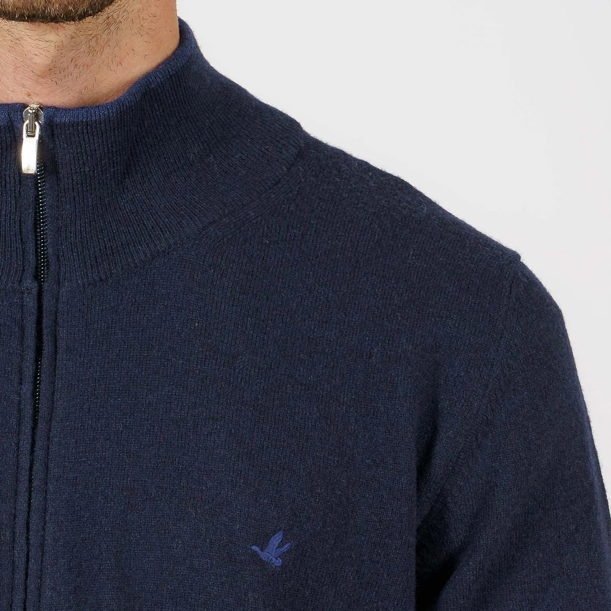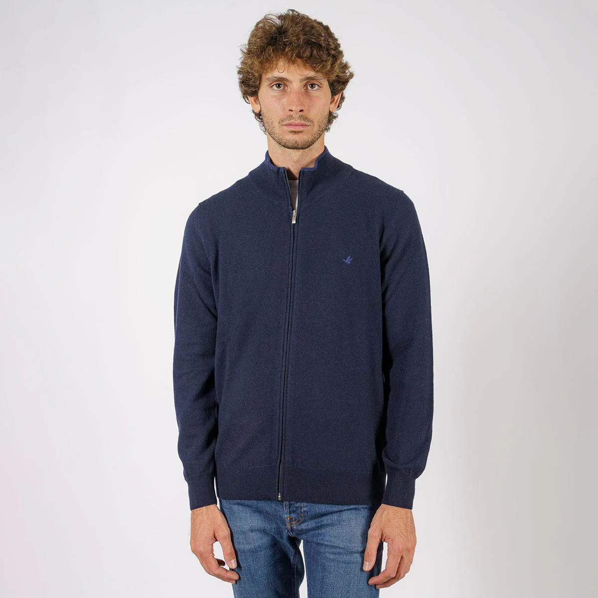 Il maglione in lana full zip con fondo e colletto a costine. Brodino colletto in contrasto colore. Logo ricamato sul petto.