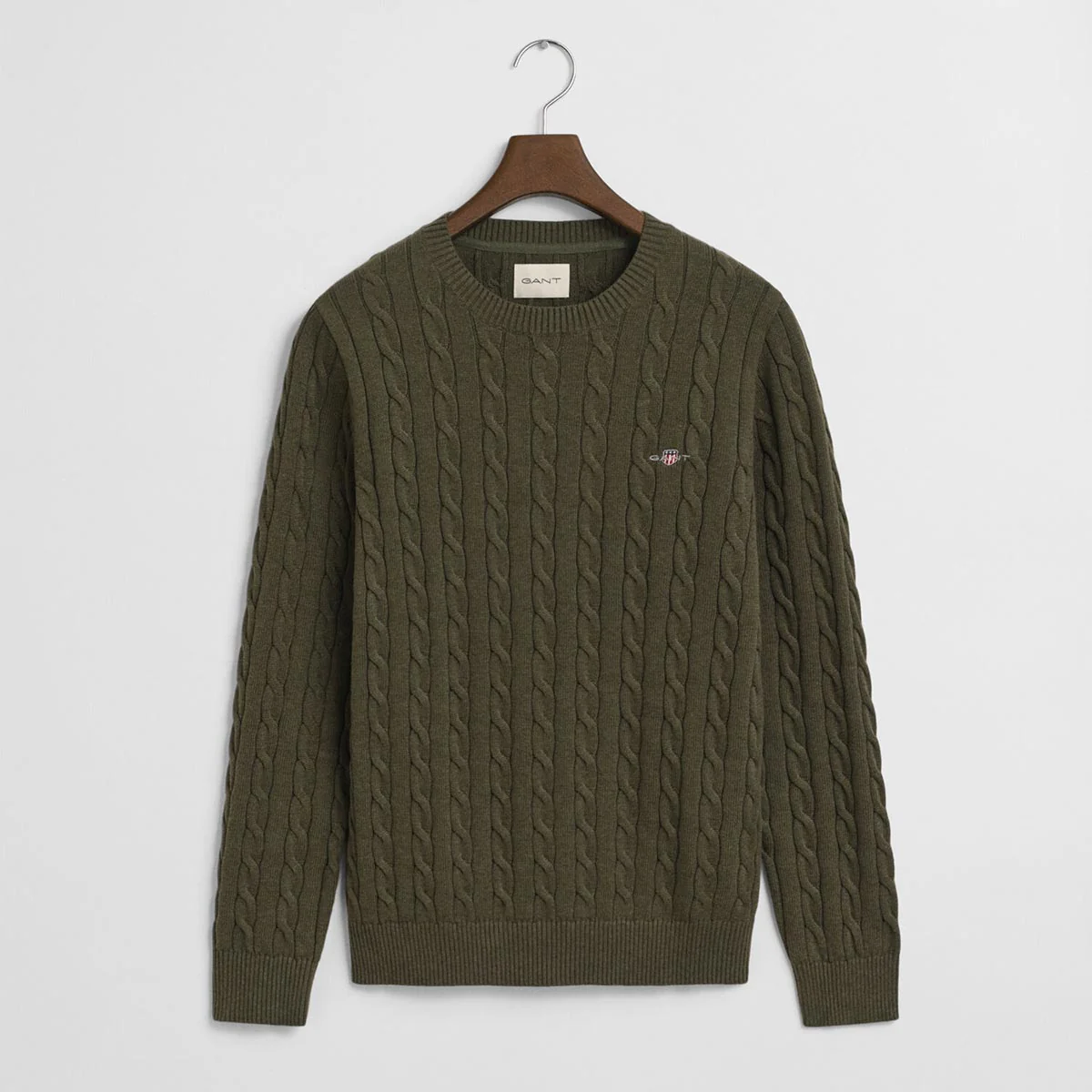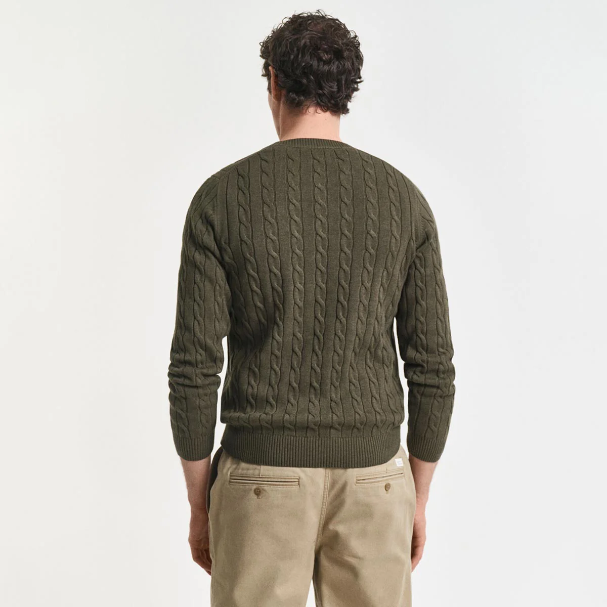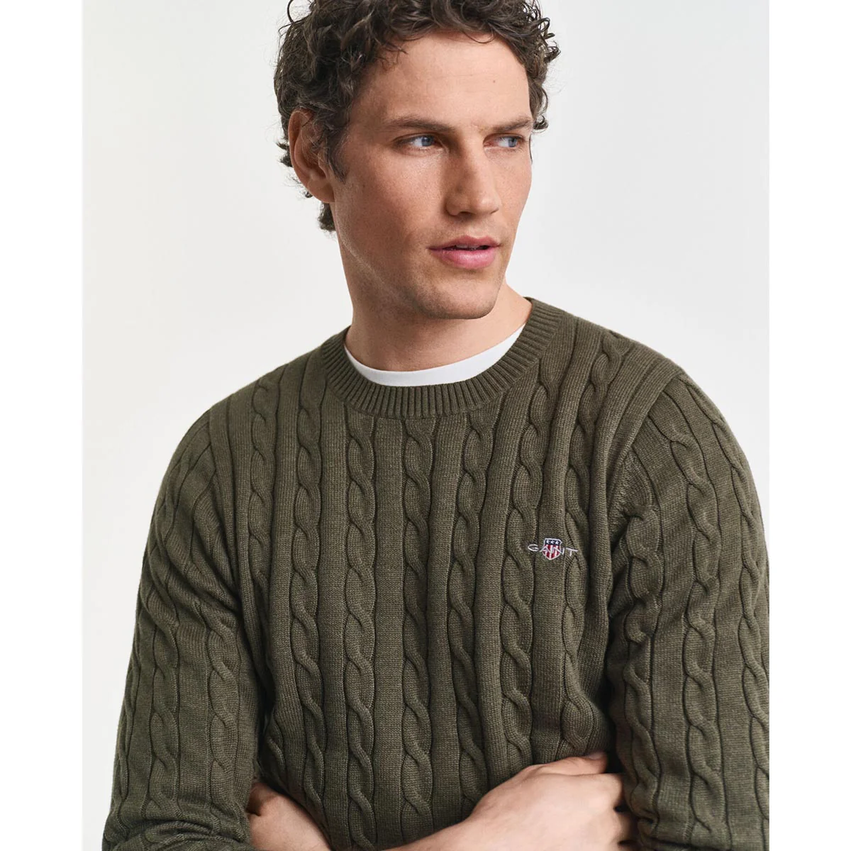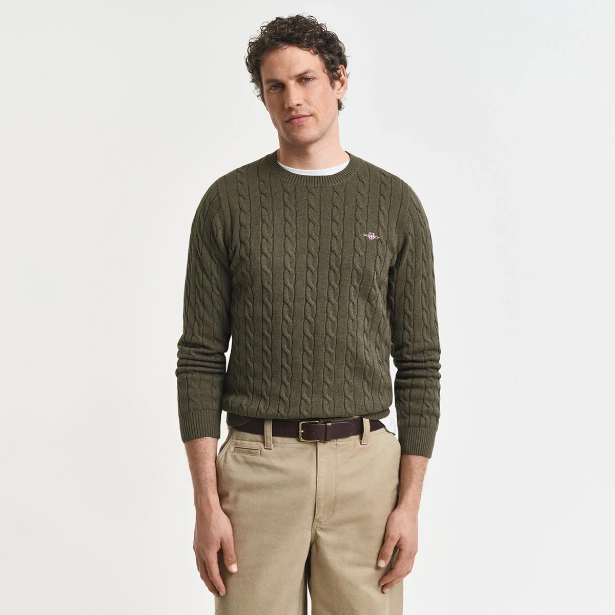 Maglione girocollo in cotone, con lavorazione a trecce, logo applicato sul petto. Motivo a costine sul fondo, sul colletto e nei polsini.