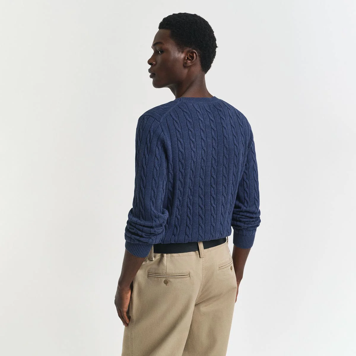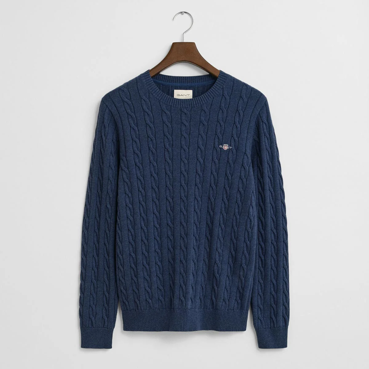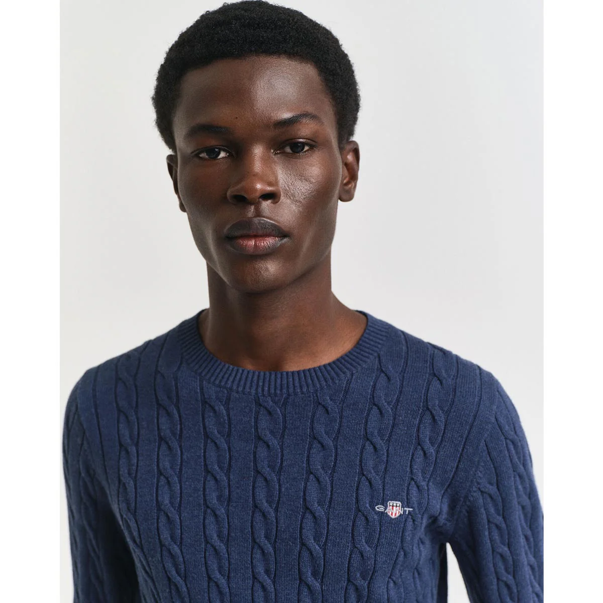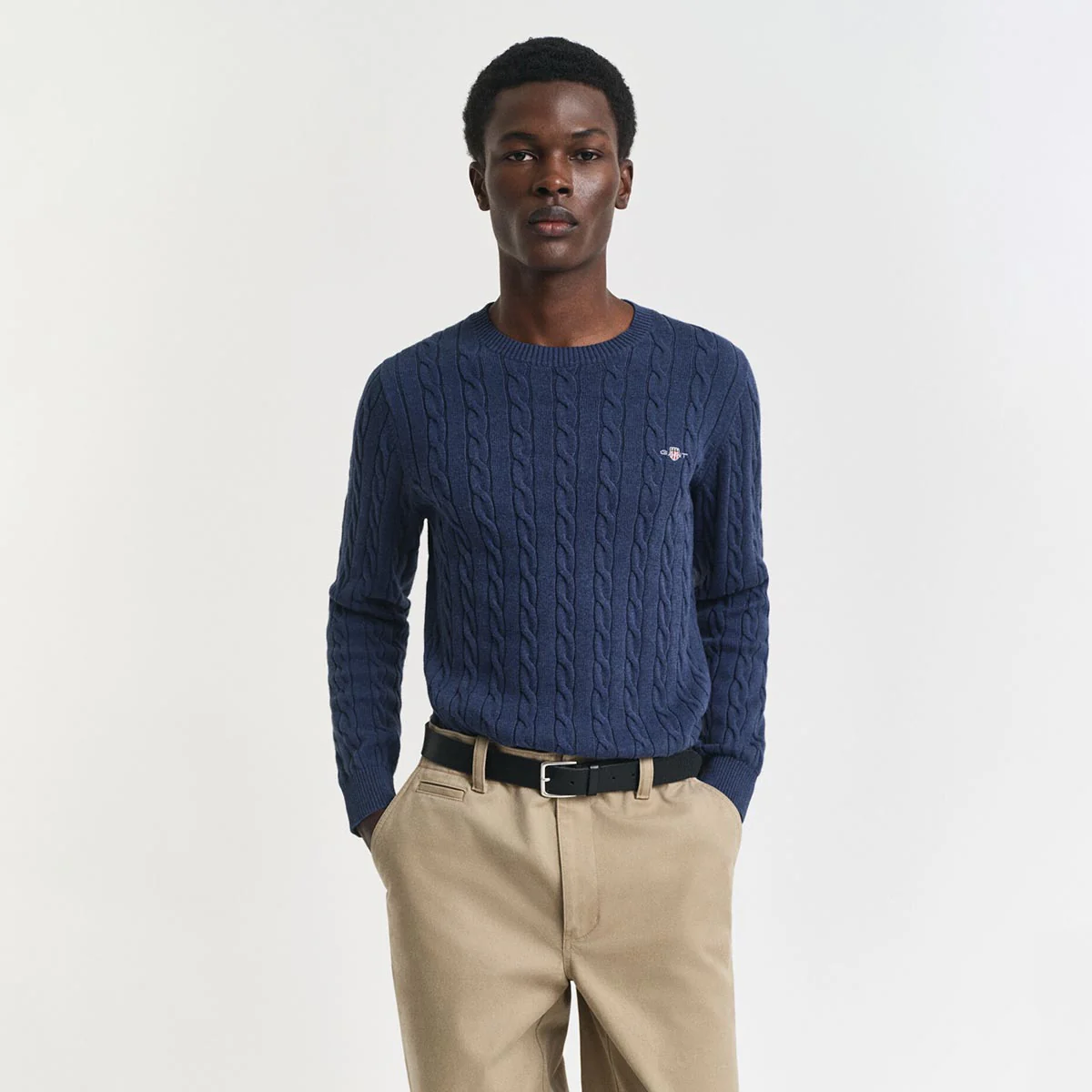 Maglione girocollo in cotone, con lavorazione a trecce, logo applicato sul petto. Motivo a costine sul fondo, sul colletto e nei polsini.