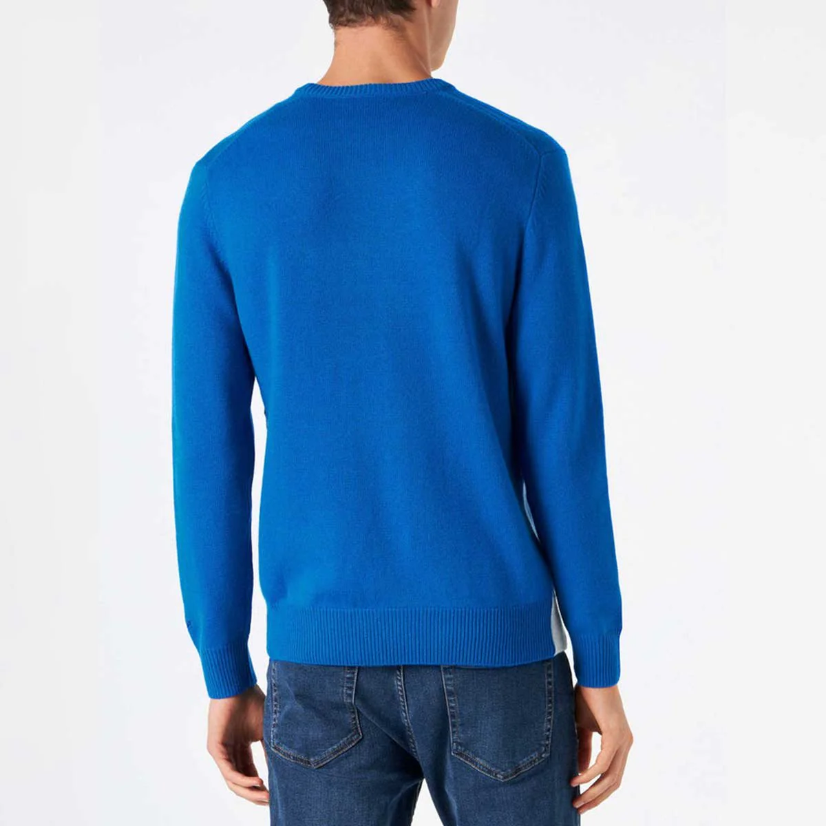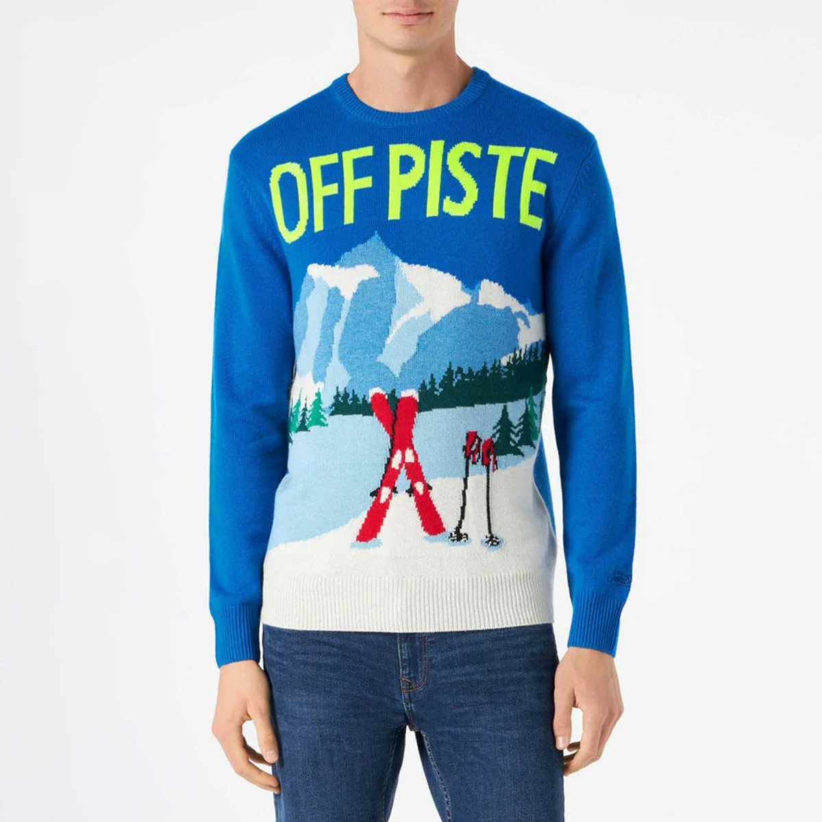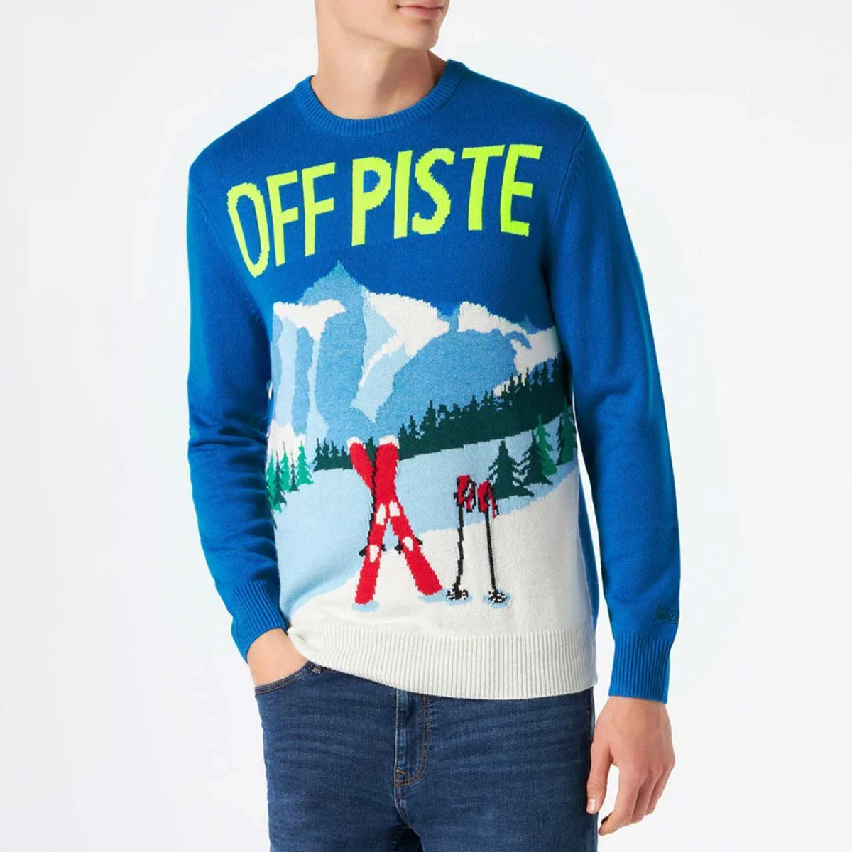 Maglione giro collo uomo Cartolina di montagna su sfondo blu Off Piste scritta sul davanti, polsini e orli a coste. Logo Saint Barth sulla manica.