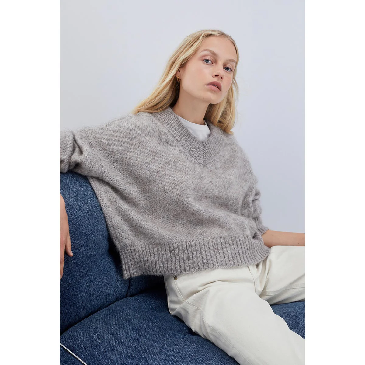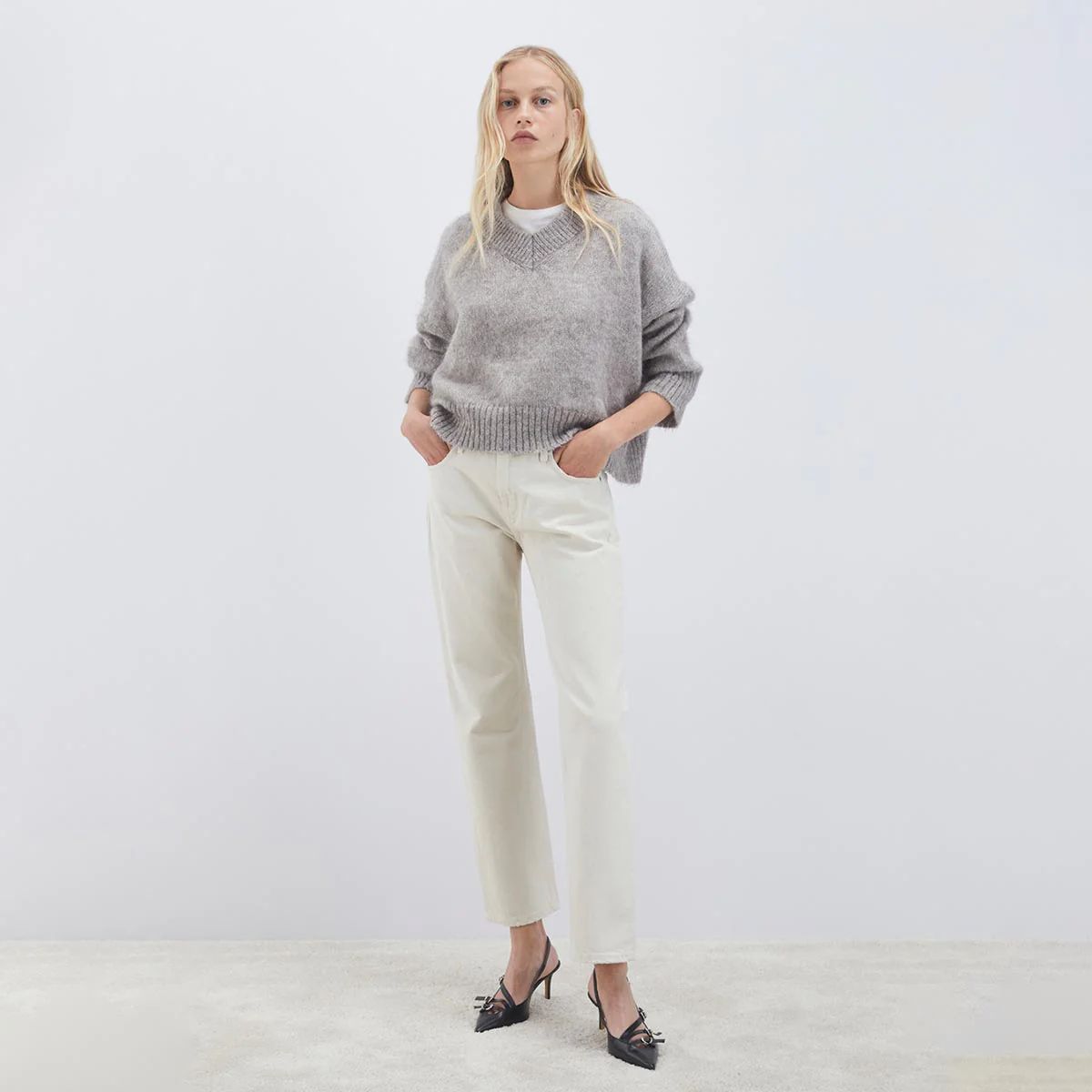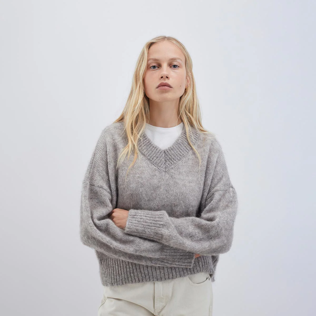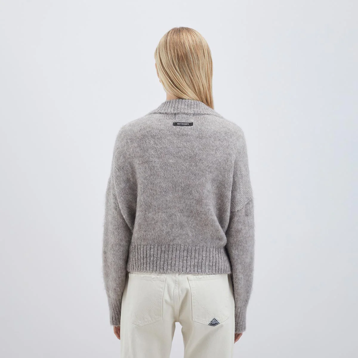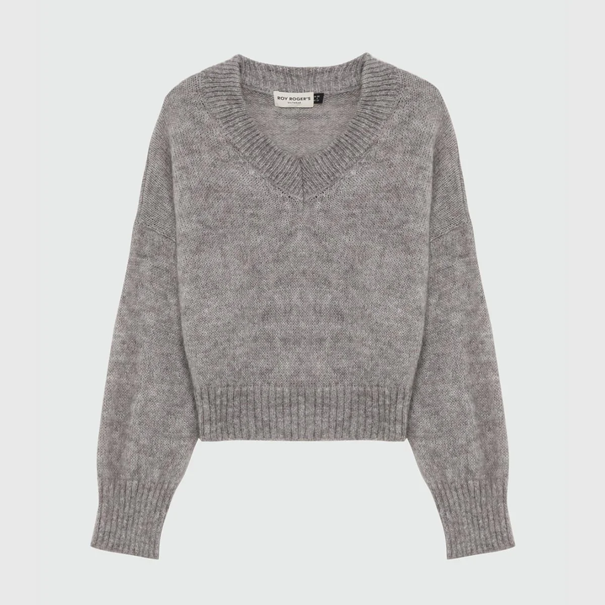 Maglia scollo V in misto mohair tinta unita melange. Maniche lunghe con spalla scesa. Collo, polsini e fondo a costine. Label Roy Roger’s applicata sul retro. Fit over.