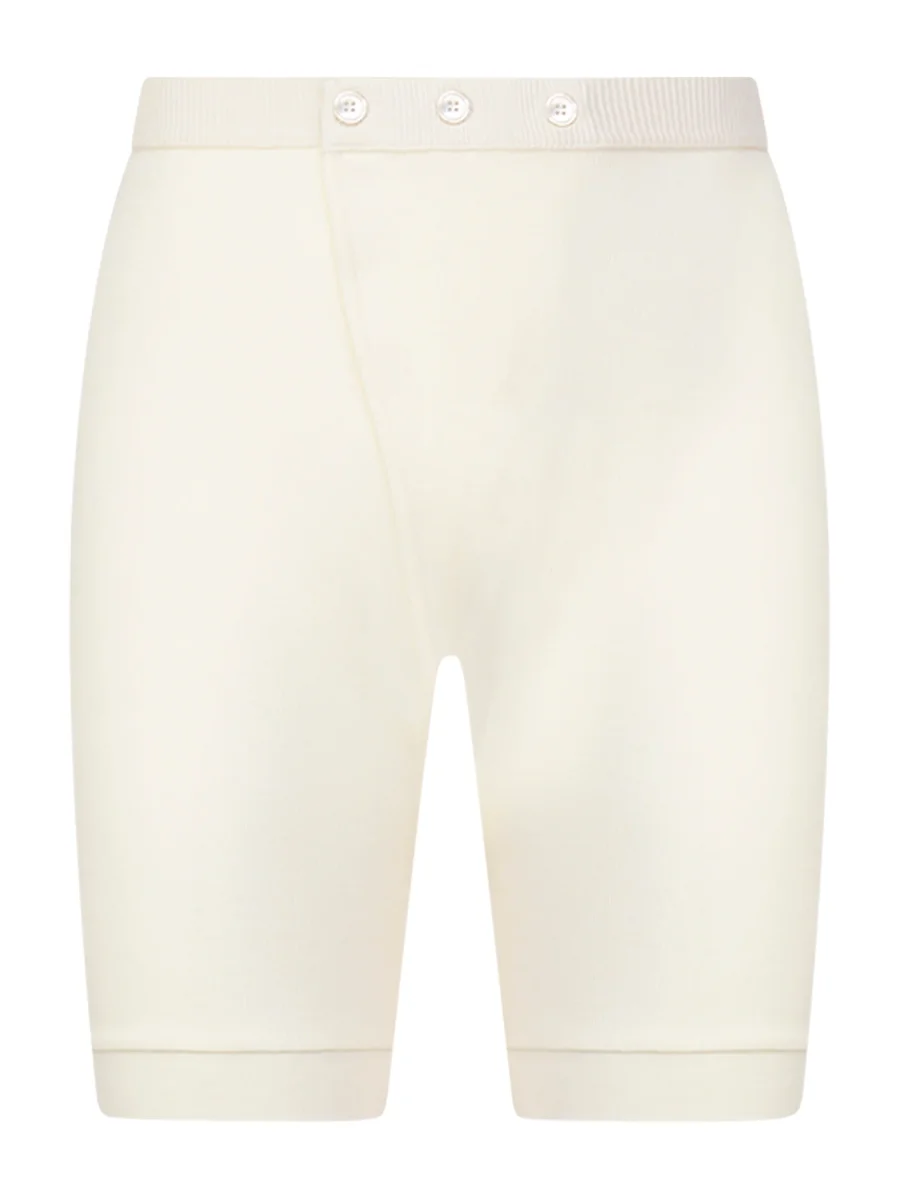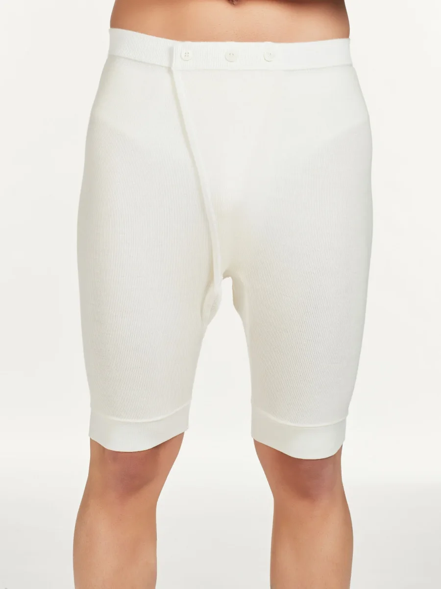 Calzamaglia corta in costina pesante di pura lana merino extrafine, con chiusura in vita tramite bottoni per una vestibilità pratica e confortevole.