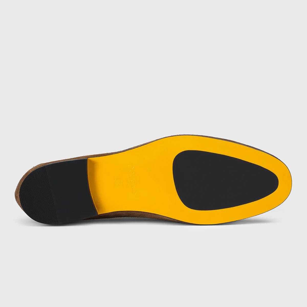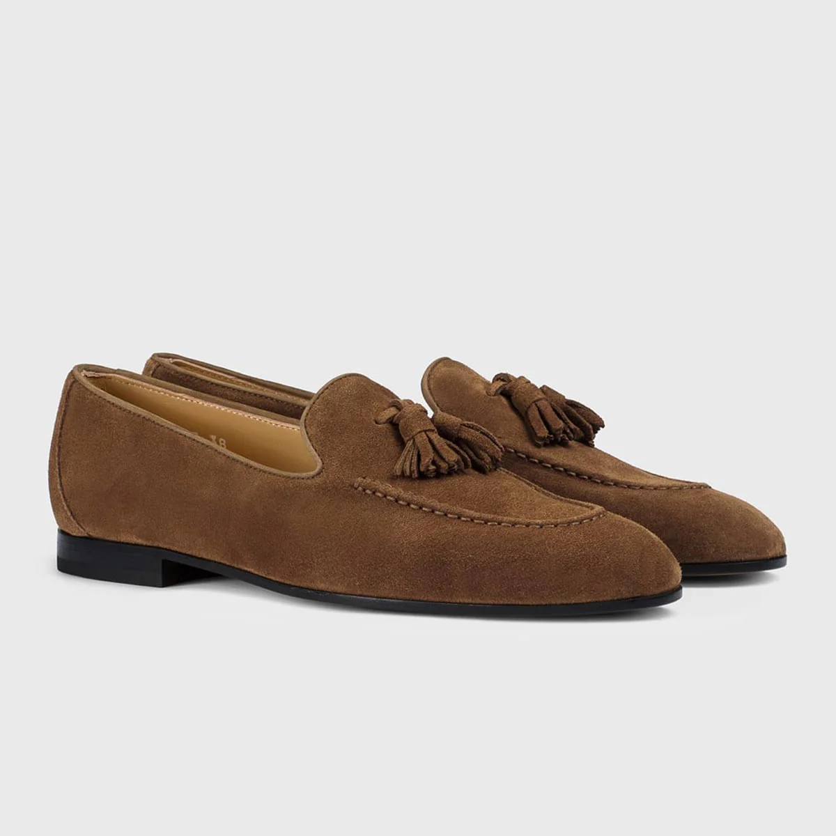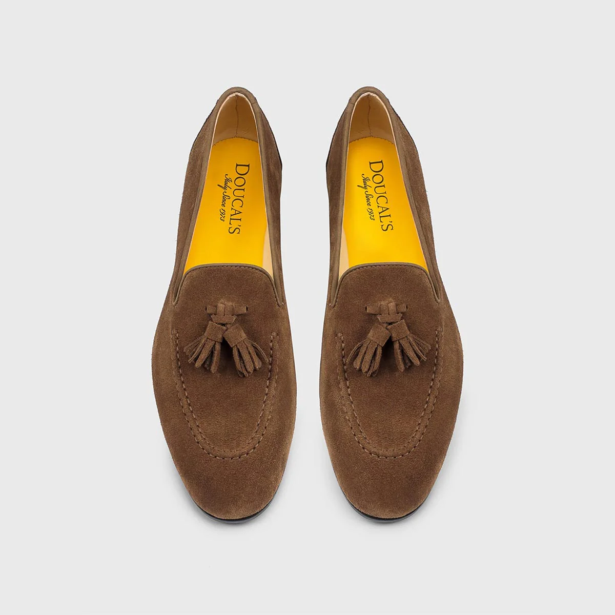 Mocassino color cannella in camoscio con nappine in materiale coordinato e cuciture a rilievo sul davanti. Suola in cuoio con grip in gomma antiscivolo.