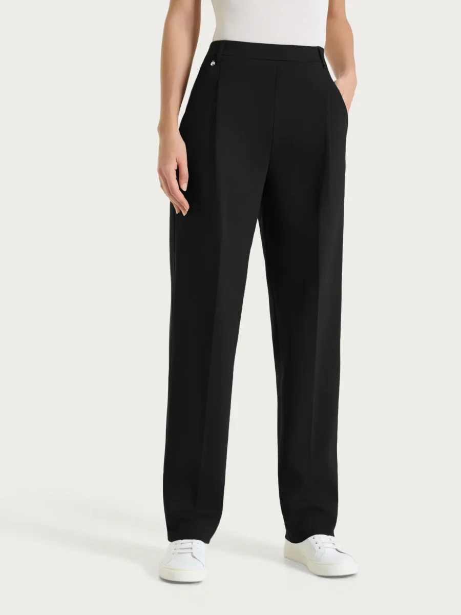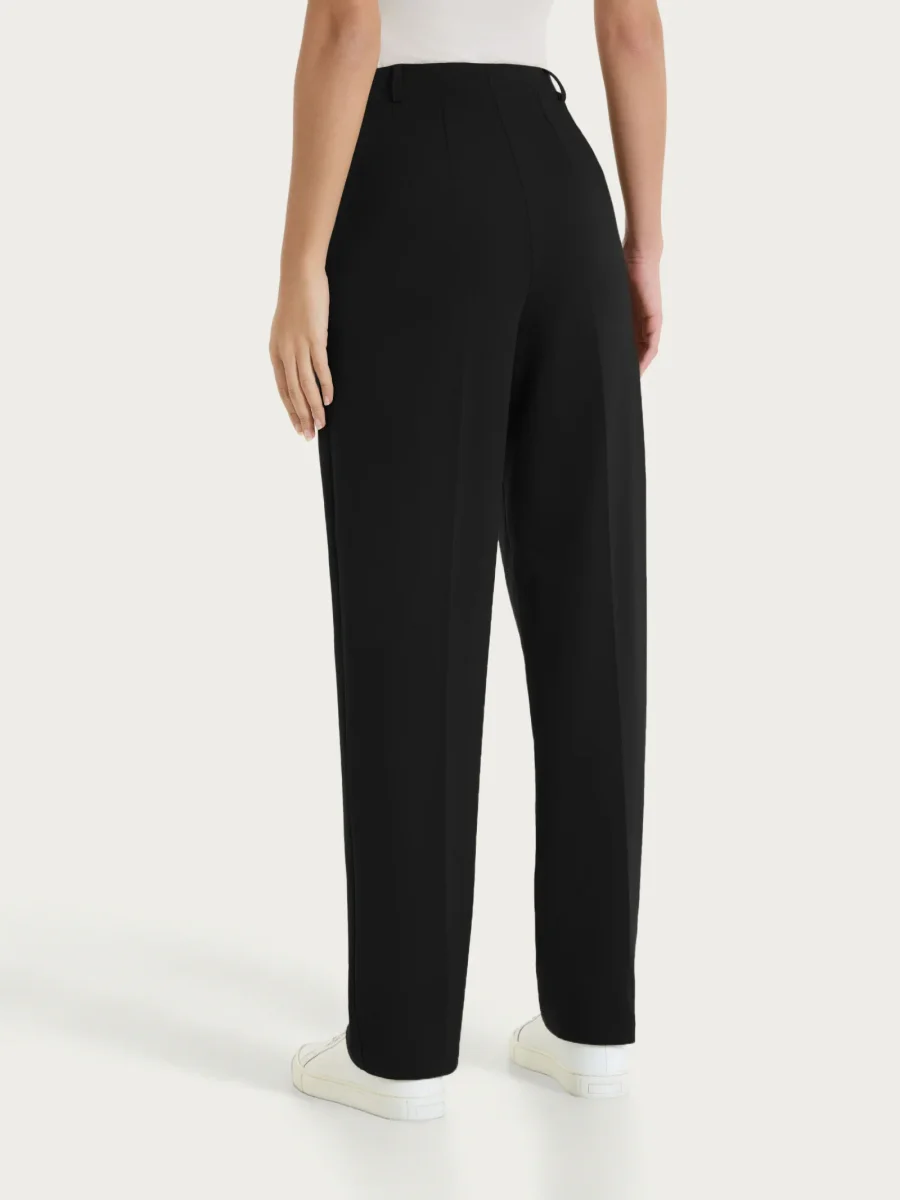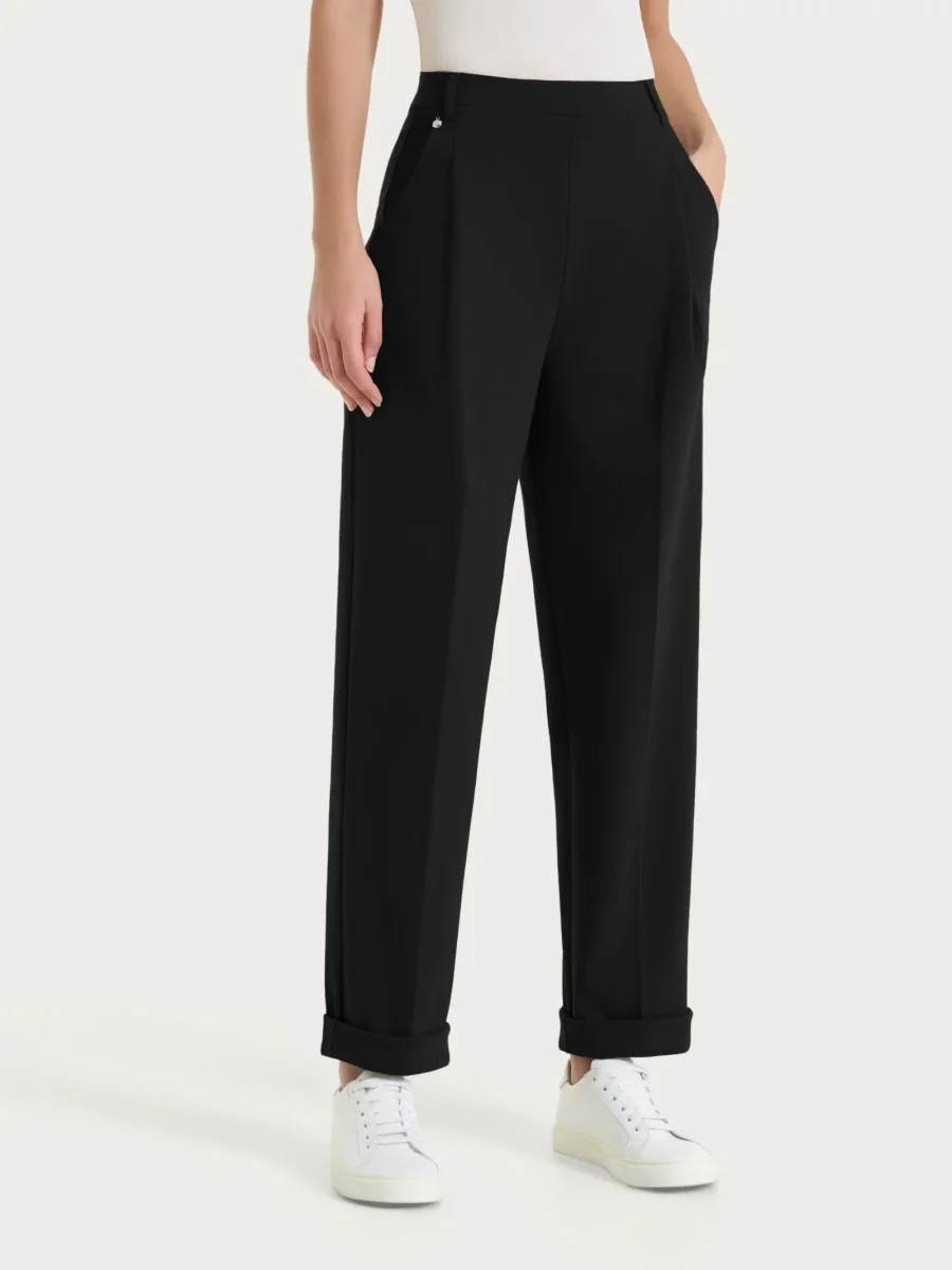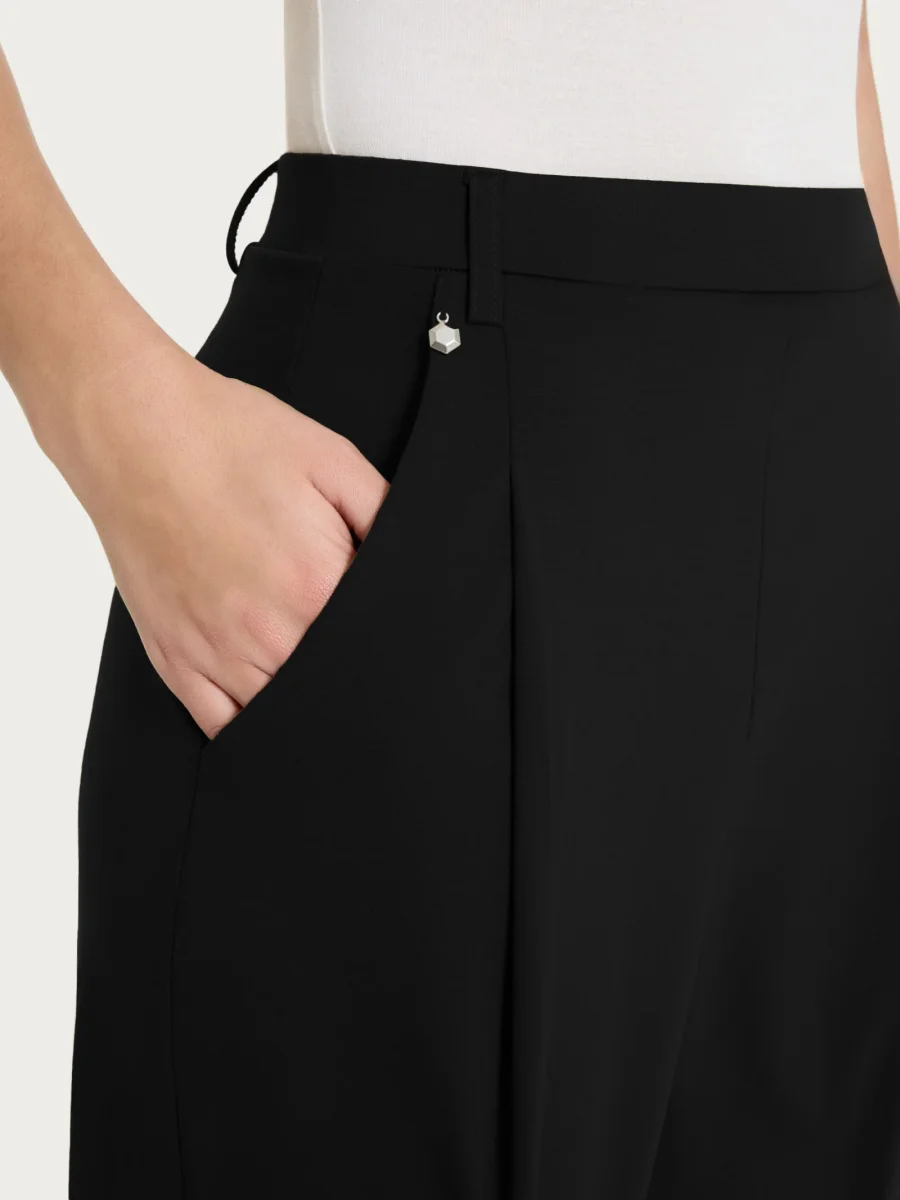Pantalone a carota da donna con vestibilità tapered, la gamba leggermente ampia si stringe verso la caviglia con lunghezza alla caviglia cropped.