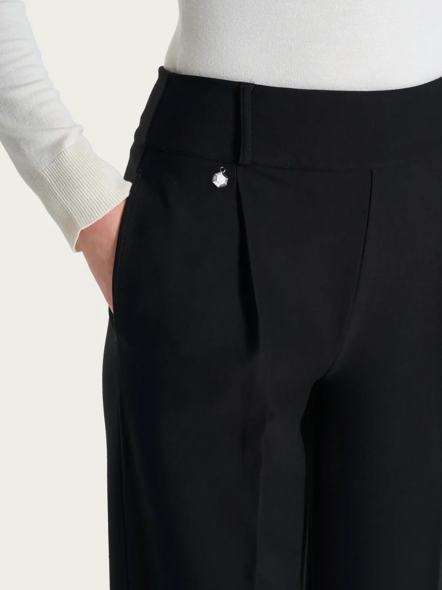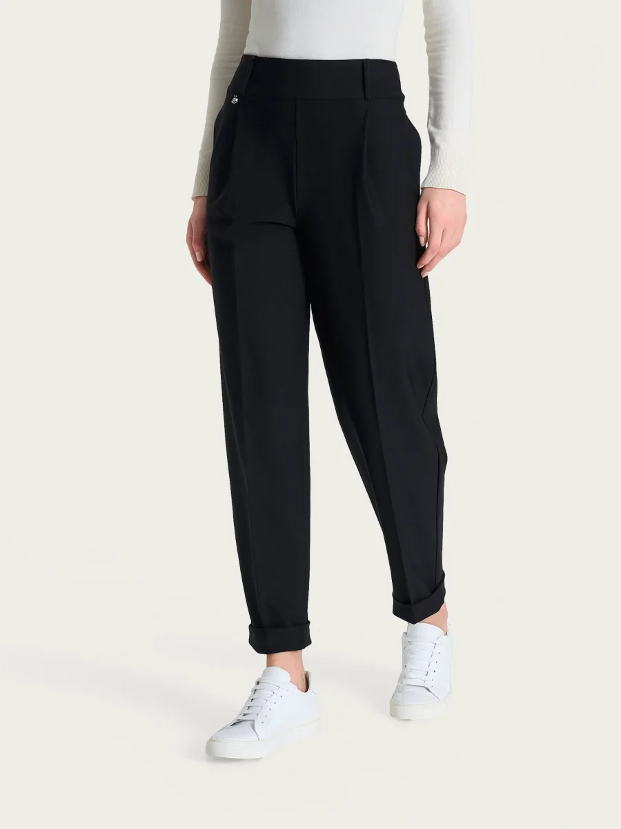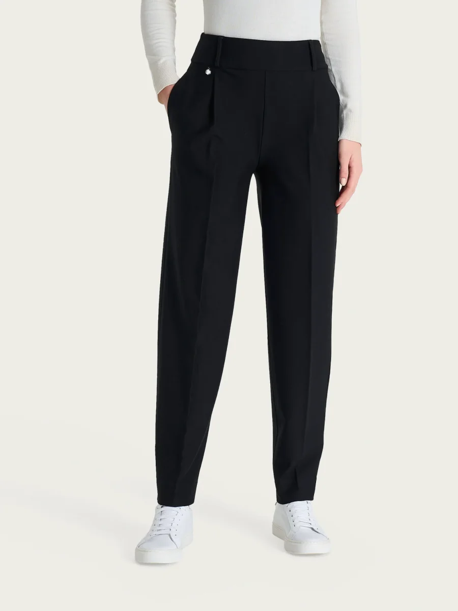 Caratterizzato dalla presenza di comode tasche laterali ed eleganti pinces, questo modello è costruito con vita elasticizzata ma con i passanti per la cintura per permetterti di aggiungere quel tocco di stile personale in più, comodo come indossare un leggings pur mantenendo l’eleganza di un pantalone.
