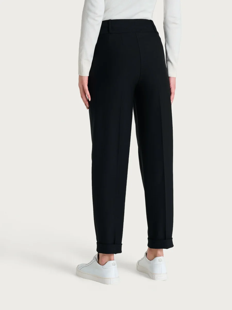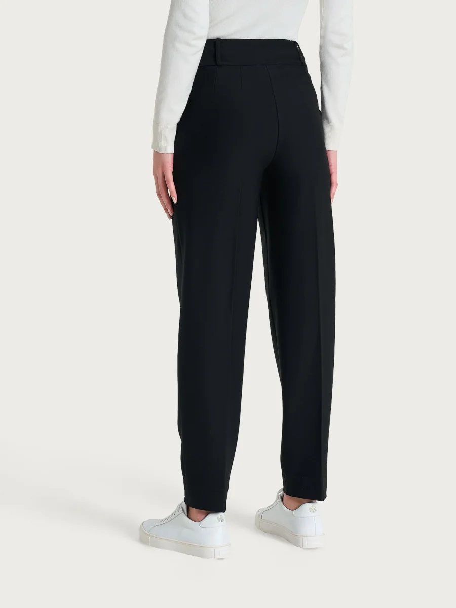 Pantalone a carota da donna con vestibilità tapered, la gamba leggermente ampia si stringe verso la caviglia.