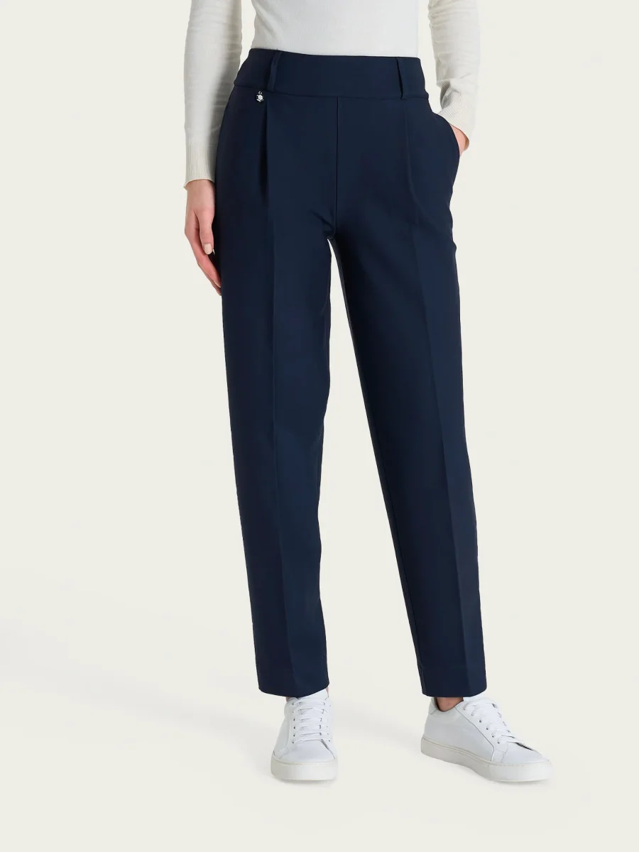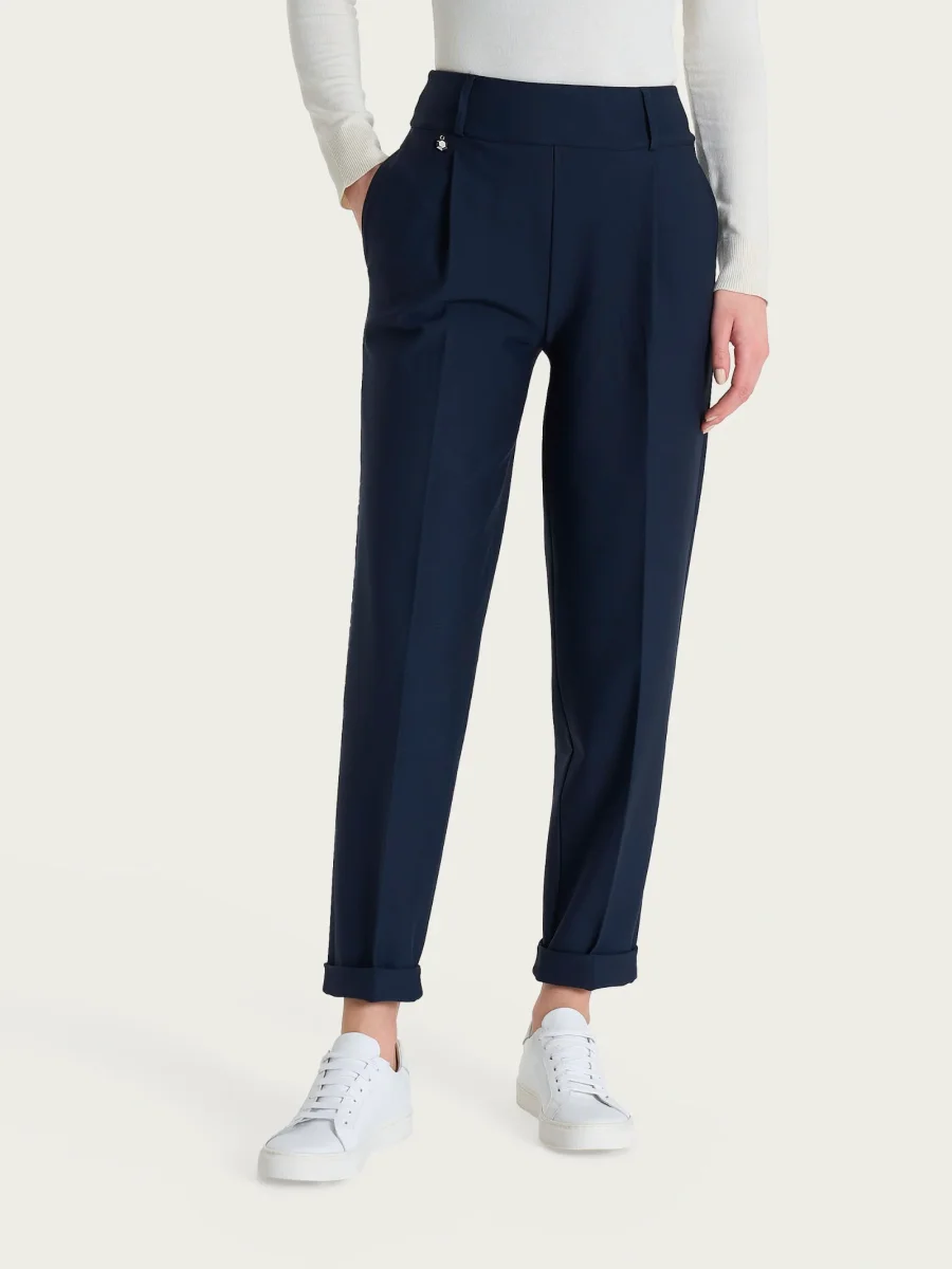 Caratterizzato dalla presenza di comode tasche laterali ed eleganti pinces, questo modello è costruito con vita elasticizzata ma con i passanti per la cintura per permetterti di aggiungere quel tocco di stile personale in più, comodo come indossare un leggings pur mantenendo l’eleganza di un pantalone.