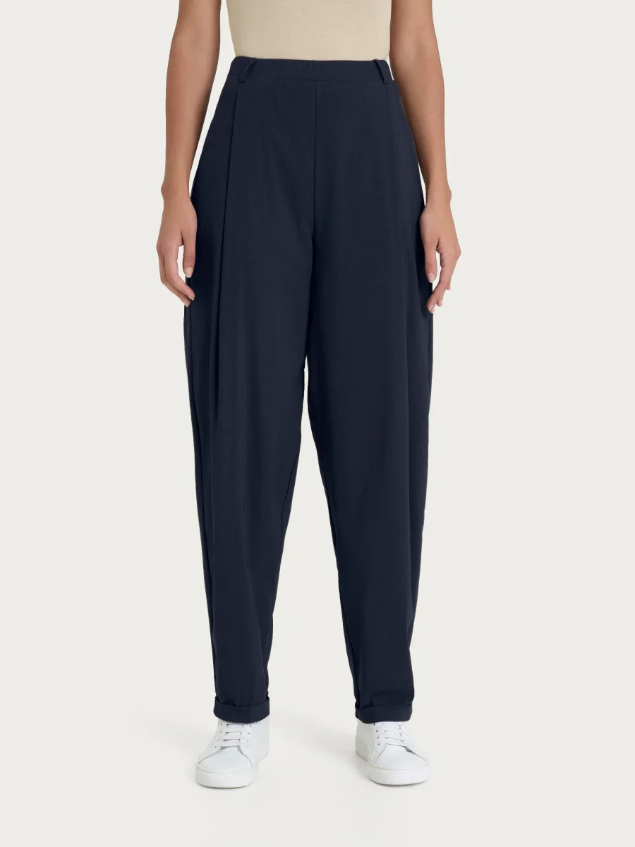 Pantalone a carota da donna con vestibilità tapered, la gamba leggermente ampia si stringe verso la caviglia.