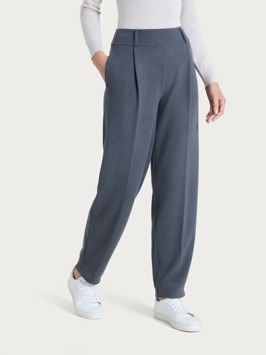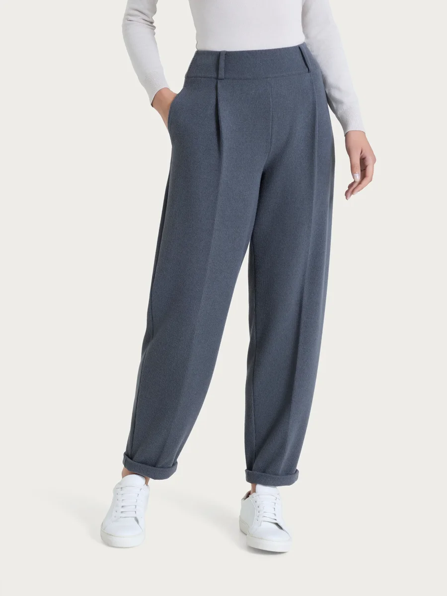 Pantalone a carota da donna con vestibilità tapered, la gamba leggermente ampia si stringe verso la caviglia.
