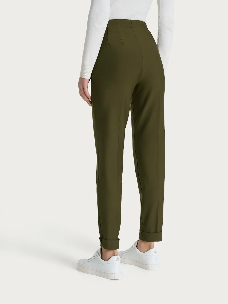 Pantalone a carota da donna con vestibilità tapered, la gamba leggermente ampia si stringe verso la caviglia.