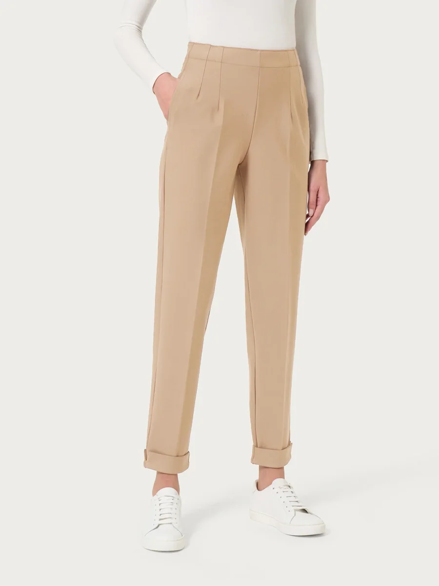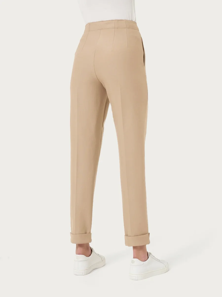 Pantalone a carota da donna con vestibilità tapered, la gamba leggermente ampia si stringe verso la caviglia.