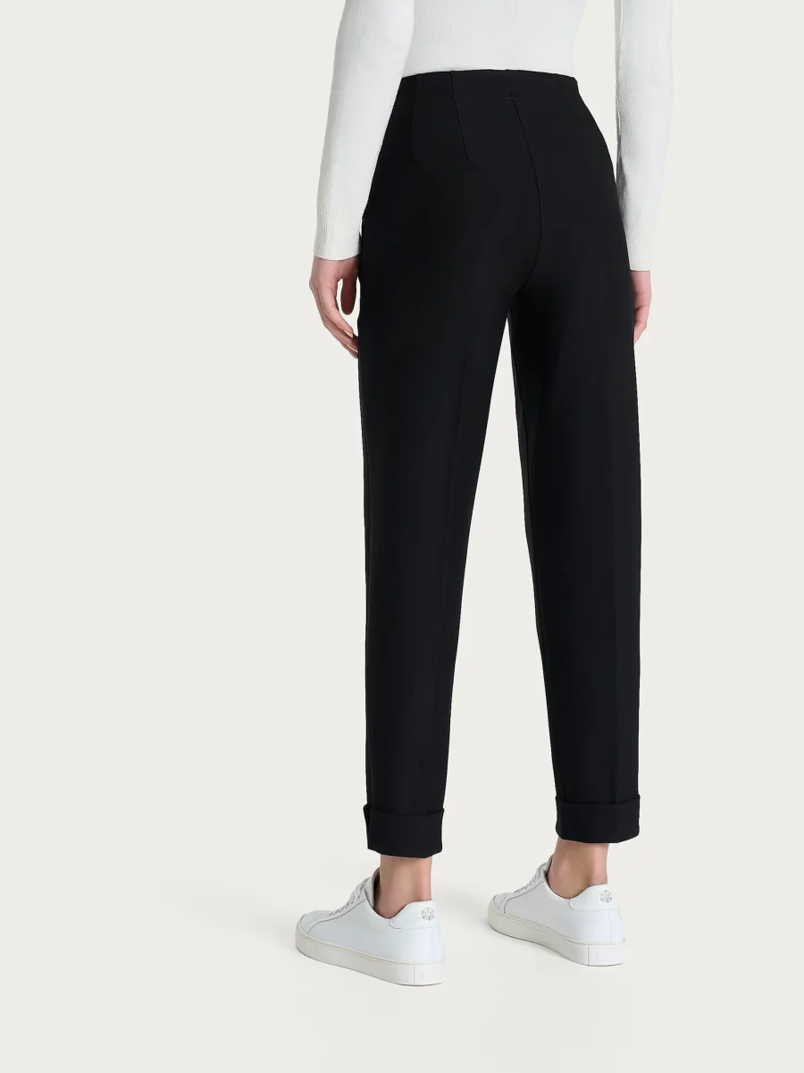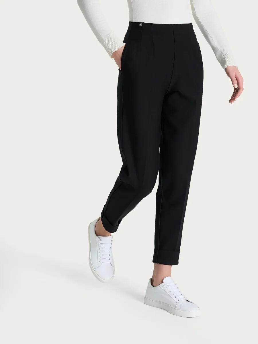 Pantalone a carota da donna con vestibilità tapered, la gamba leggermente ampia si stringe verso la caviglia.