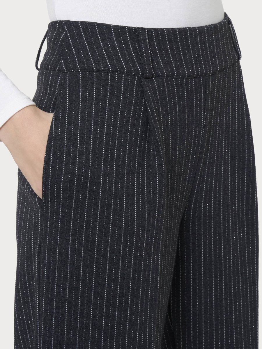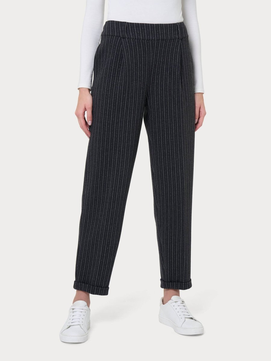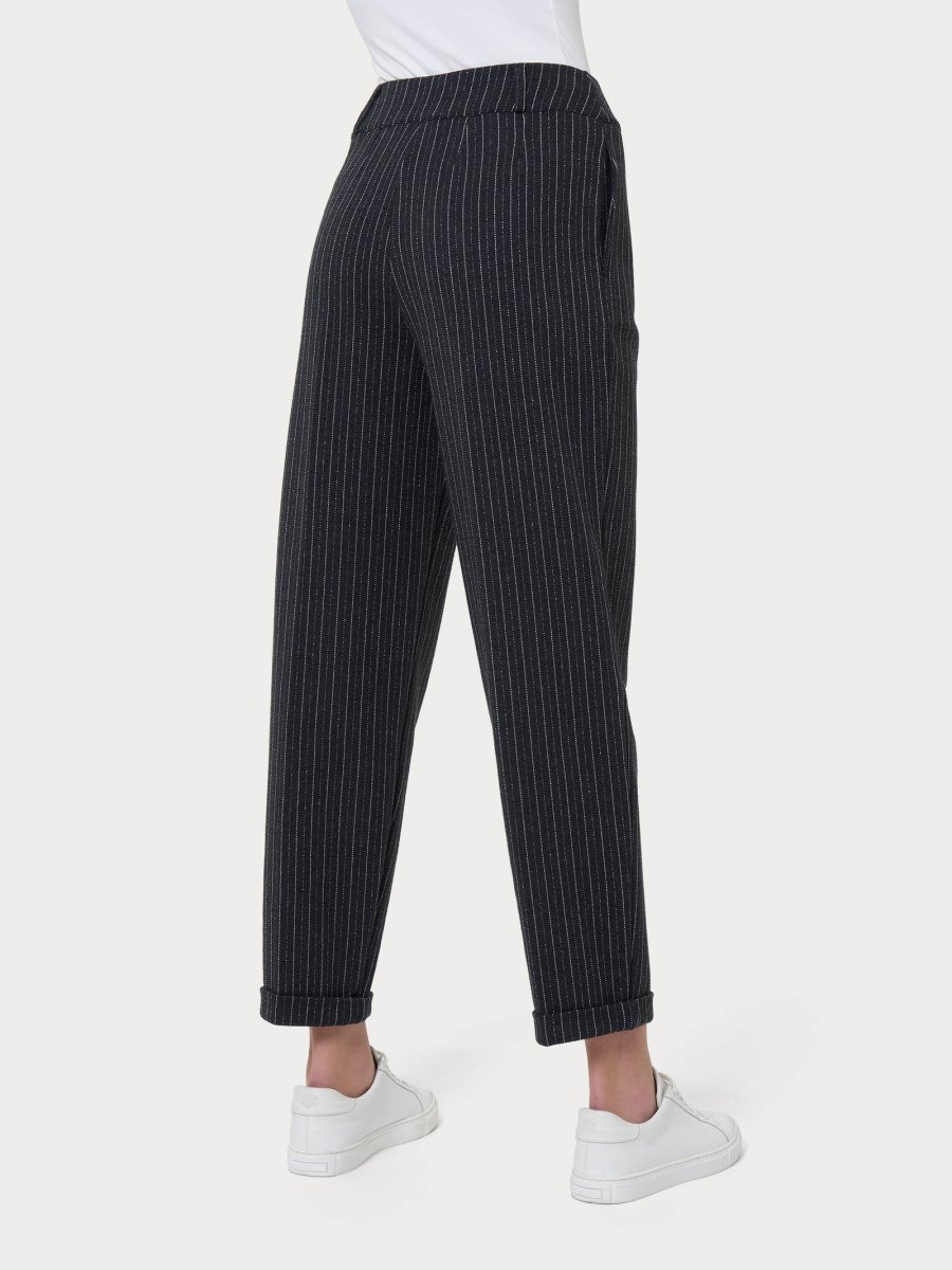 Pantalone a carota gessato da donna con vestibilità tapered, la gamba leggermente ampia si stringe verso la caviglia.