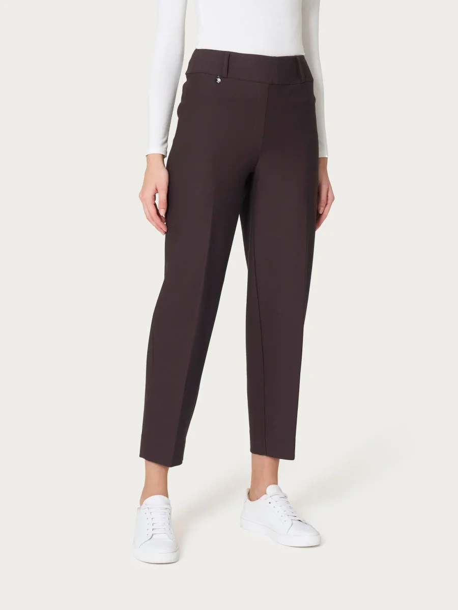 Pantalone a carota da donna con vestibilità tapered, la gamba leggermente ampia si stringe verso la caviglia, lunghezza cropped alla caviglia.