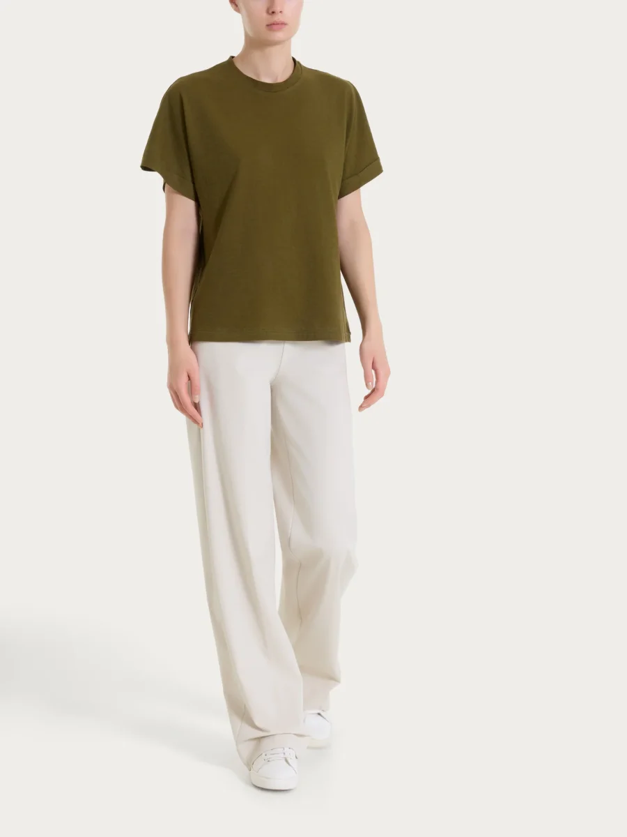La vita elasticizzata assicura una vestibilità comoda e stabile, seguendo il corpo con naturalezza e offrendo comfort durante tutta la giornata. Il tutto è completato dai passanti per cintura, un dettaglio curato che ti permette di personalizzare l’outfit e dare al look un tocco di stile in più.