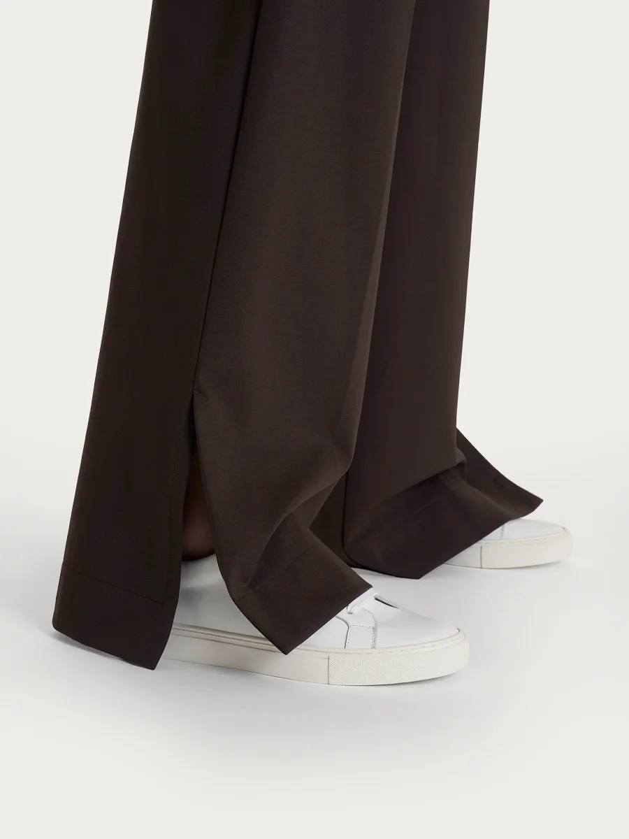 Questo particolare dettaglio ha una duplice funzione: da un lato, dona al pantalone un aspetto fluido e dinamico, enfatizzando il movimento a ogni passo; dall’altro, lascia intravedere delicatamente la gamba, creando un effetto elegante senza risultare eccessivo rendendo quindi il capo perfetto anche per essere indossato con un tacco nei momenti più formali.