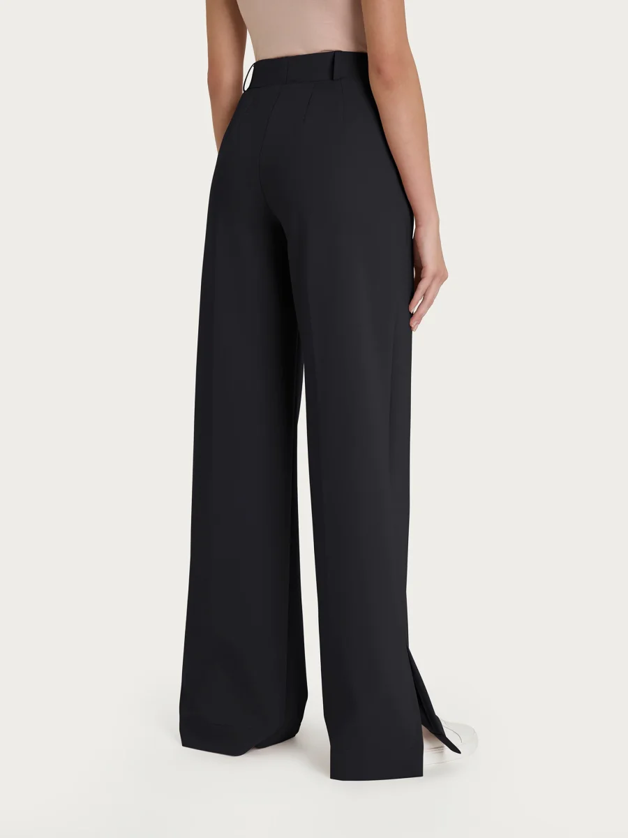 Questo particolare dettaglio ha una duplice funzione: da un lato, dona al pantalone un aspetto fluido e dinamico, enfatizzando il movimento a ogni passo; dall’altro, lascia intravedere delicatamente la gamba, creando un effetto elegante senza risultare eccessivo rendendo quindi il capo perfetto anche per essere indossato con un tacco nei momenti più formali.