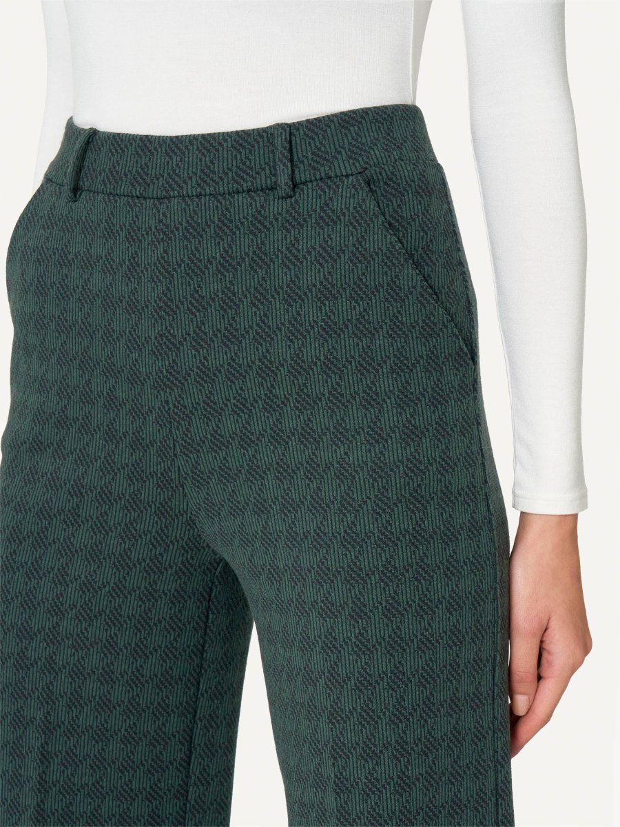 Realizzato nell’esclusivo tessuto Jacquard, un punto Milano particolarmente elasticizzato che imita per stabilità e peso un tessuto navetta pur mantenendo la caratteristica elasticità dei tessuti a maglia. Inoltre la particolare tessitura jacquard consente di realizzare raffinati disegni tinto filo.