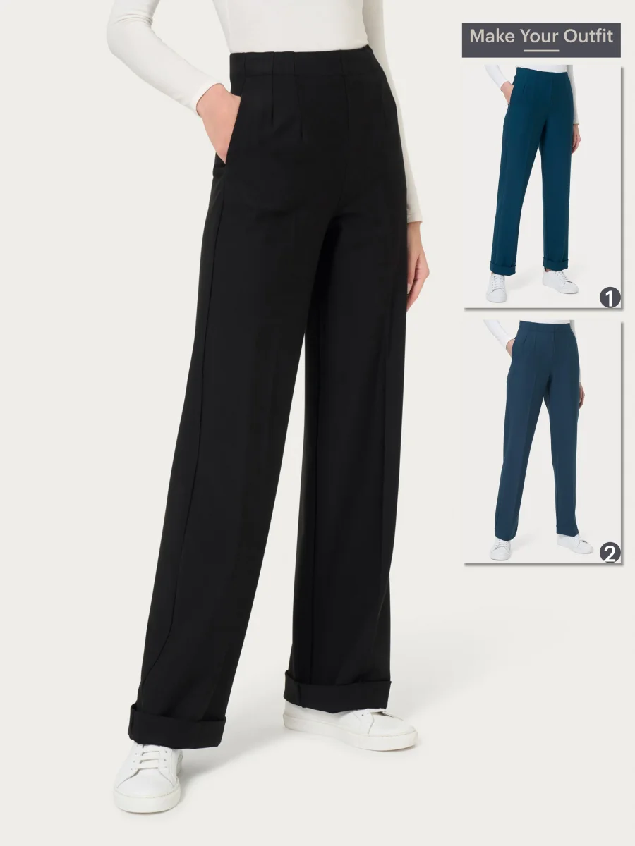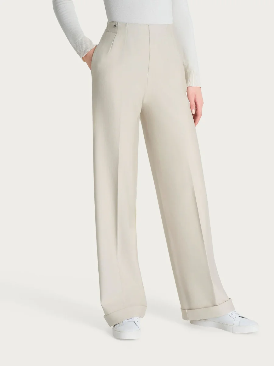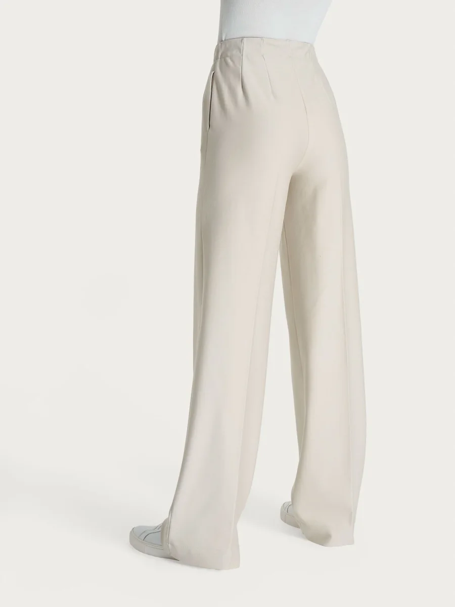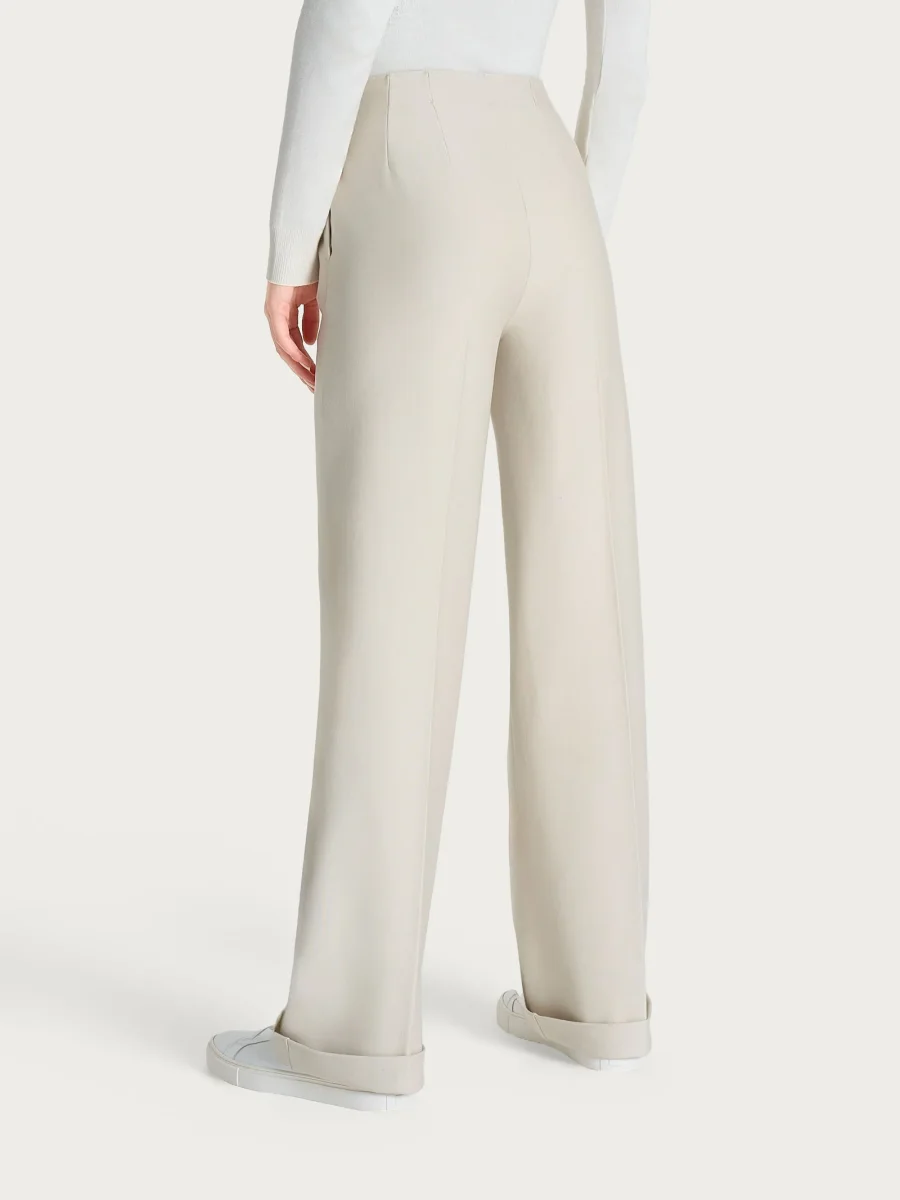 Questo modello è costruito con vita elasticizzata senza passanti, ma con delicate pinces sia sul davanti che sul retro per una maggiore eleganza. Con pratiche tasche laterali è comodo come indossare un leggings pur mantenendo l’eleganza di un pantalone.