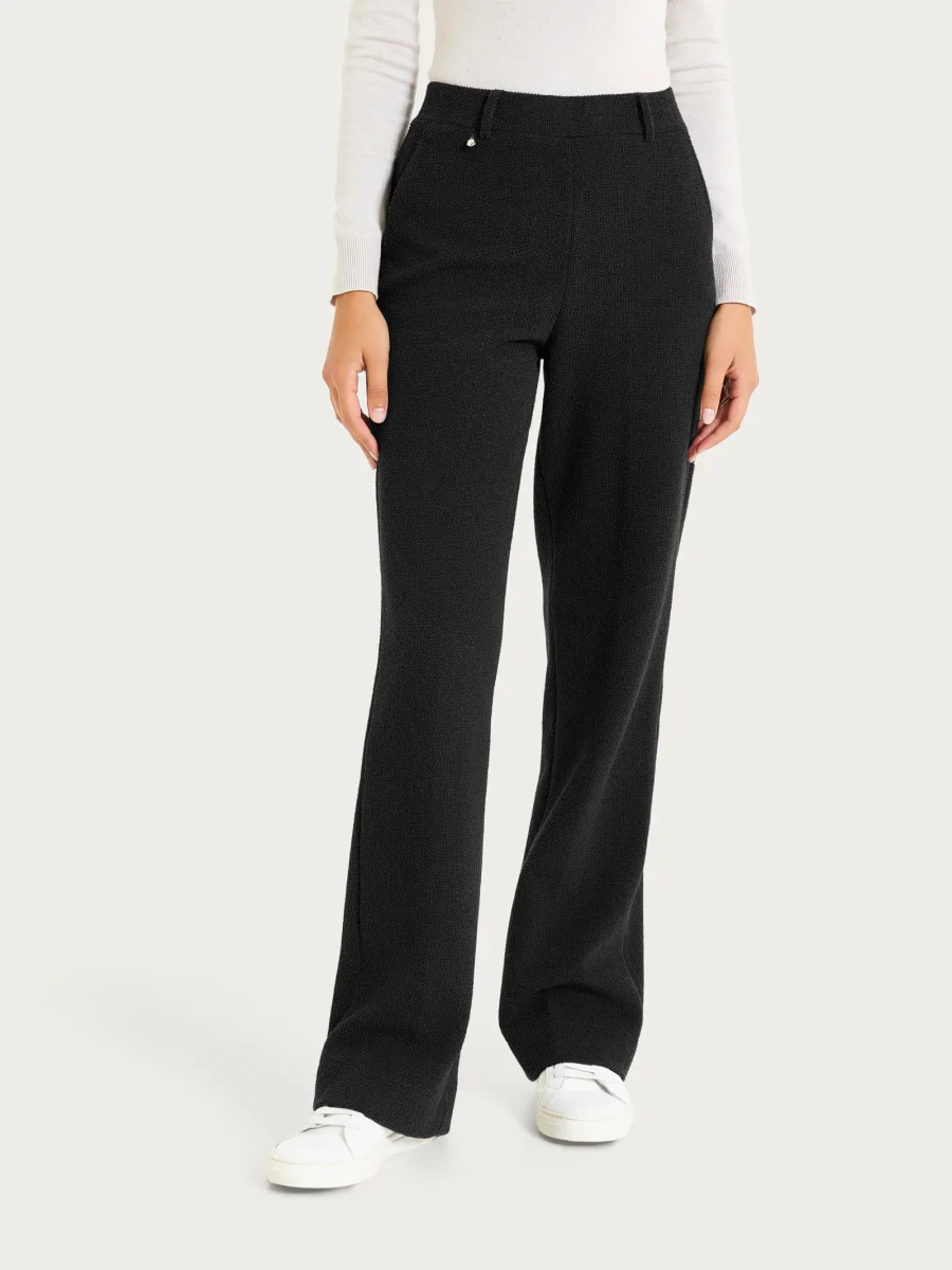 Questo modello senza tasche è costruito con vita elasticizzata senza passanti, comodo come indossare un leggings pur mantenendo l’eleganza di un pantalone.
