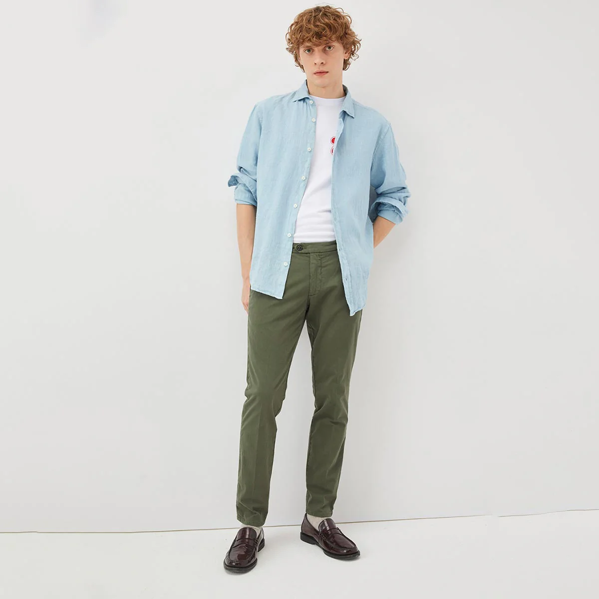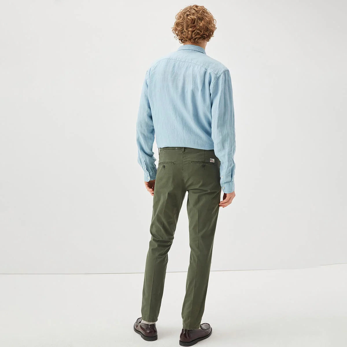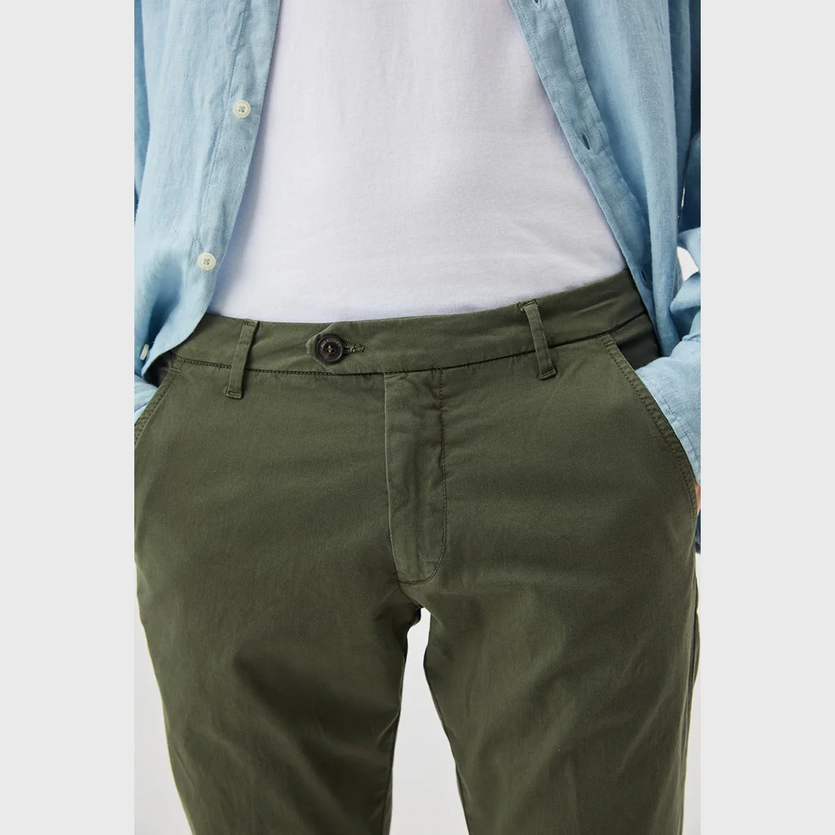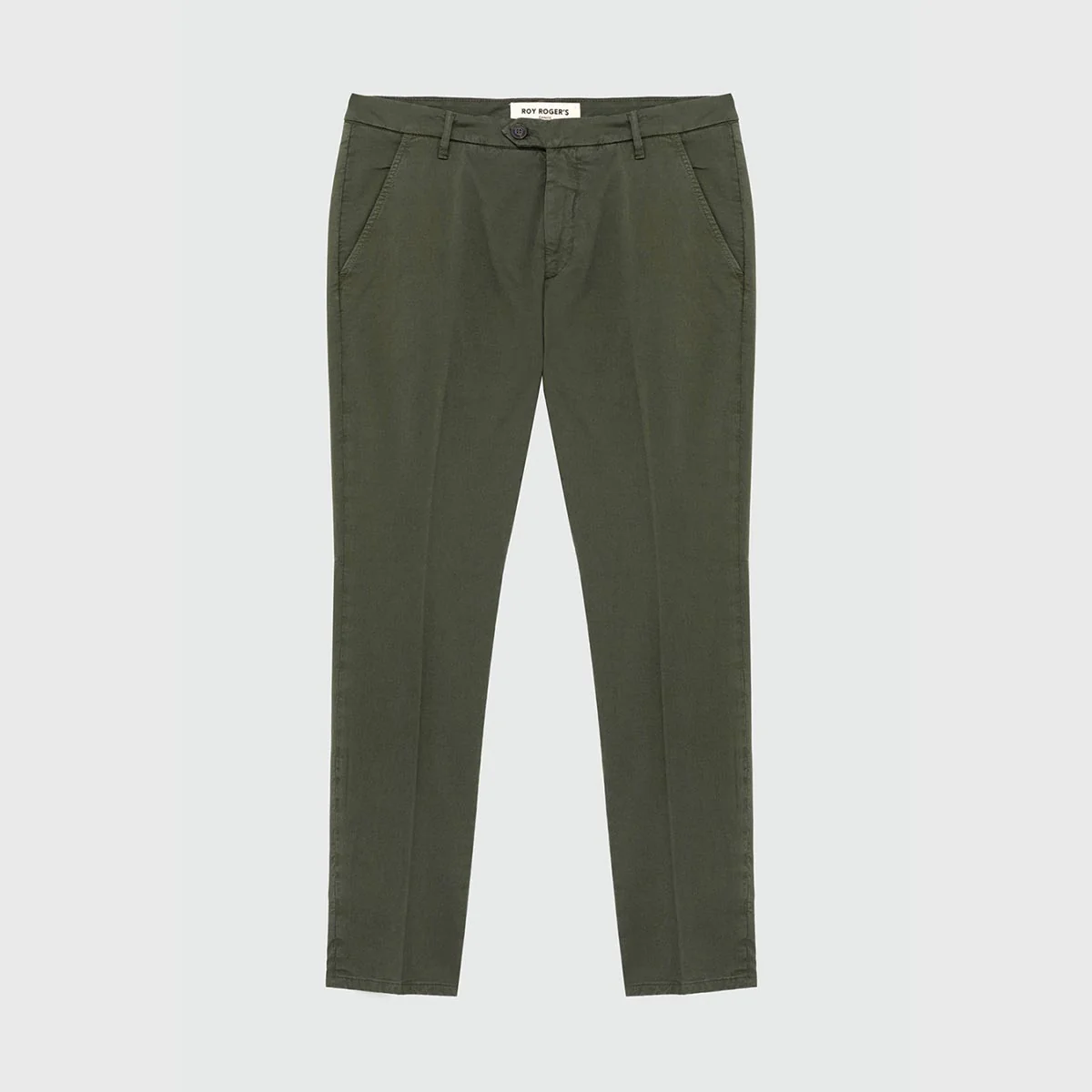 Pantalone in gabardina tinta unita. Vita media con passanti. Due tasche all’americana sul fronte e due tasche a filetto sul retro con bottone logato. Chiusura con bottone logato e zip. Label Roy Roger’s applicata sul retro. Slim fit.
