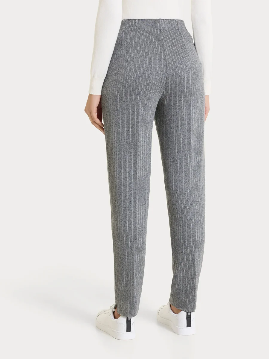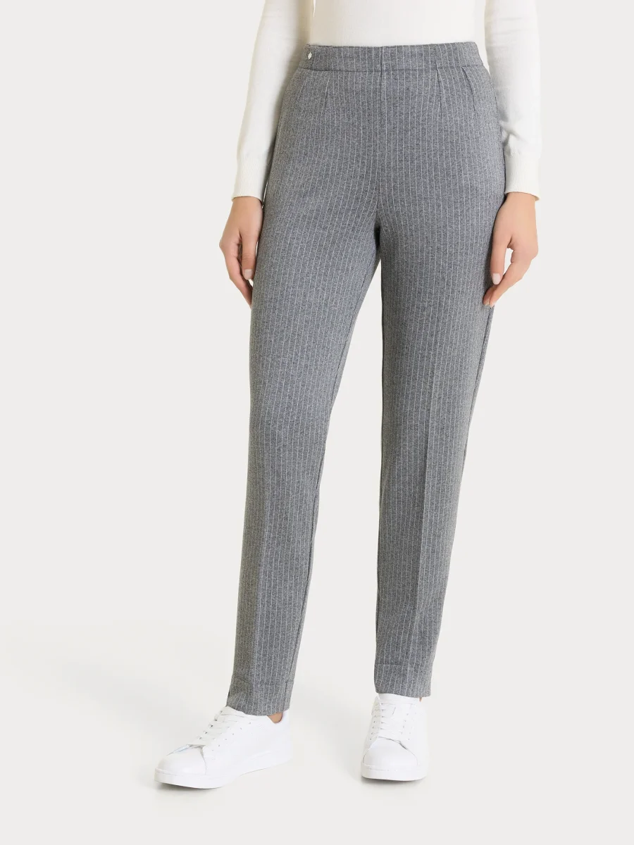 Questo modello gessato con sottili righe verticali è costruito con vita elasticizzata e senza zip, ma con pratiche tasche laterali. Il risvolto regolabile con piccolo spacchetto finale rende possibile la personalizzazione del look secondo le esigenze di stile e preferenze personali.