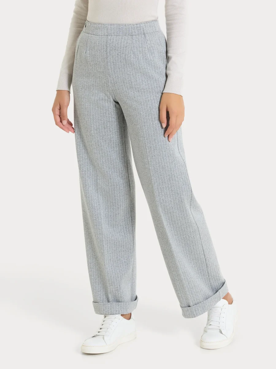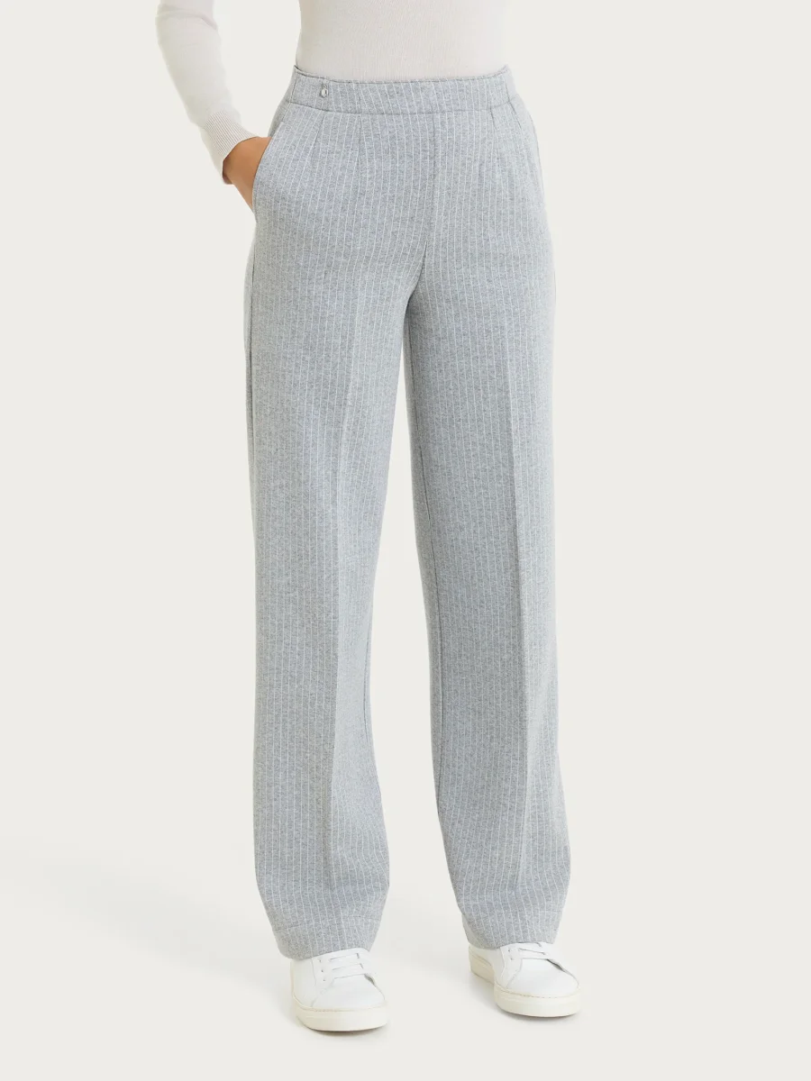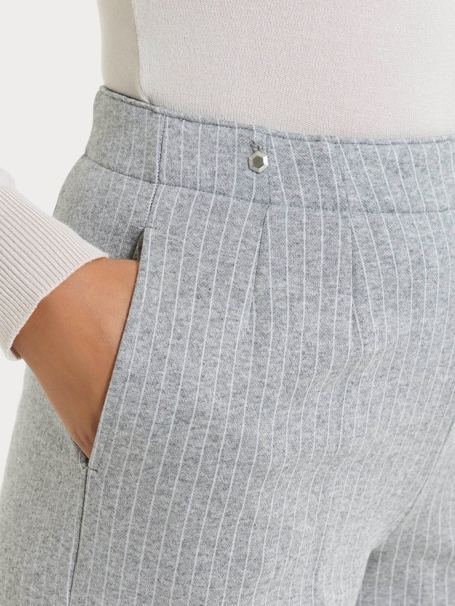 Questo modello gessato con sottili righe verticali è costruito con vita elasticizzata e senza zip, ma con pratiche tasche laterali.