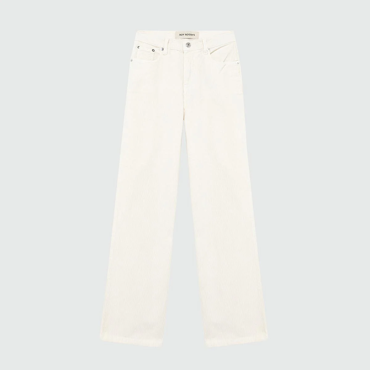 Pantalone in velluto a coste tinta unita. Vita media con passanti e pences. Chiusura con bottone logato e zip. Due tasche sul fronte e due tasche sul retro con label Roy Roger’s applicato. Flare fit.