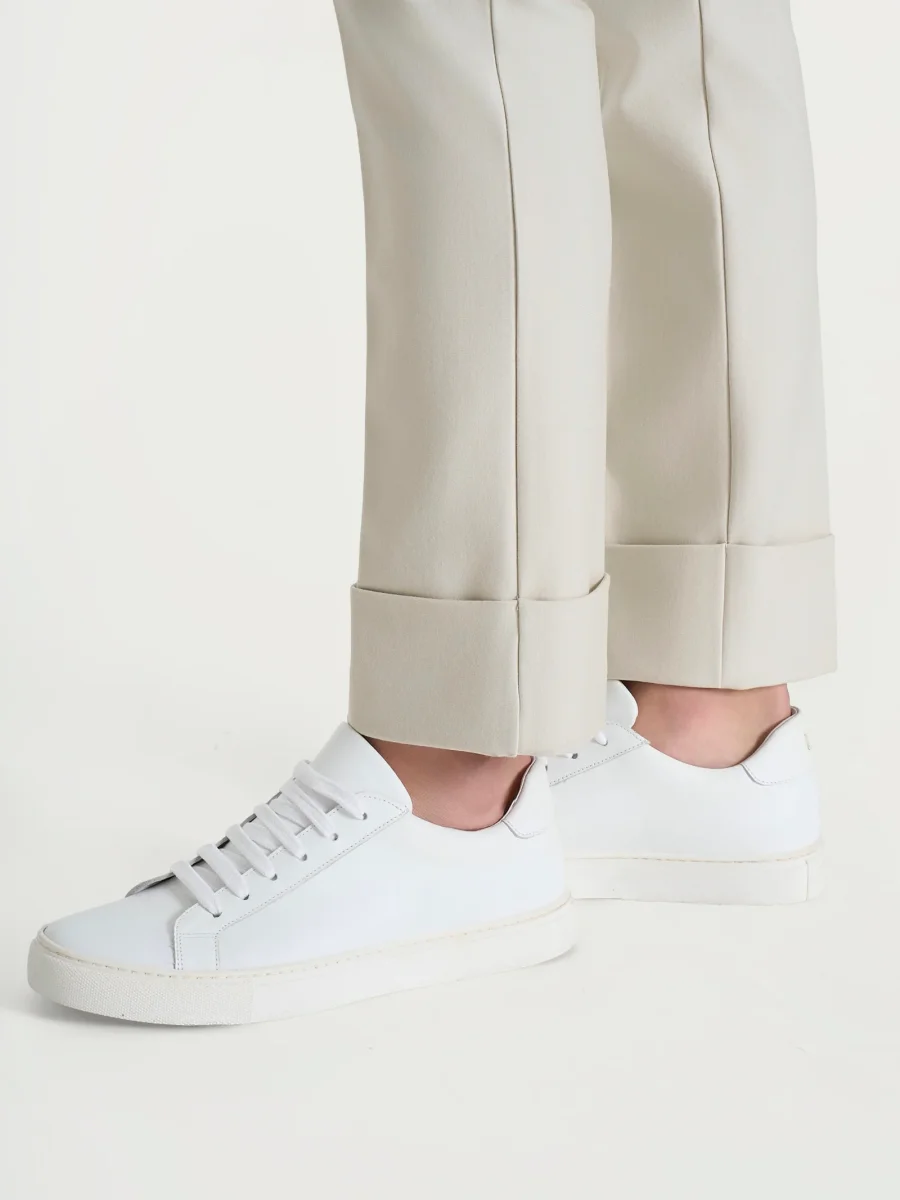 Questo modello è costruito con vita elasticizzata ma con i passanti per la cintura per permetterti di aggiungere quel tocco di stile personale in più, senza tasche. Le tasche posteriori sono finte per offrire la giusta estetica senza inficiarne la vestibilità slim, mentre sul fondo è presente un delicato risvolto fisso per un tocco di stile distintivo.