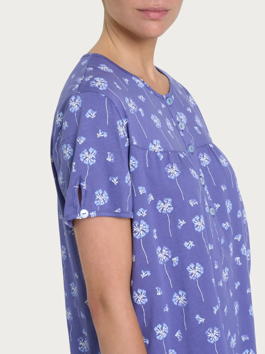 La casacca, dotata di un elegante collo a serafino e maniche corte, è perfetta per affrontare le notti di mezza stagione con praticità e raffinatezza. La fantasia all-over di soffioni conferisce un aspetto delicato e leggero, evocando la sensazione di petali che si disperdono al vento e aggiungendo un tocco poetico al design.