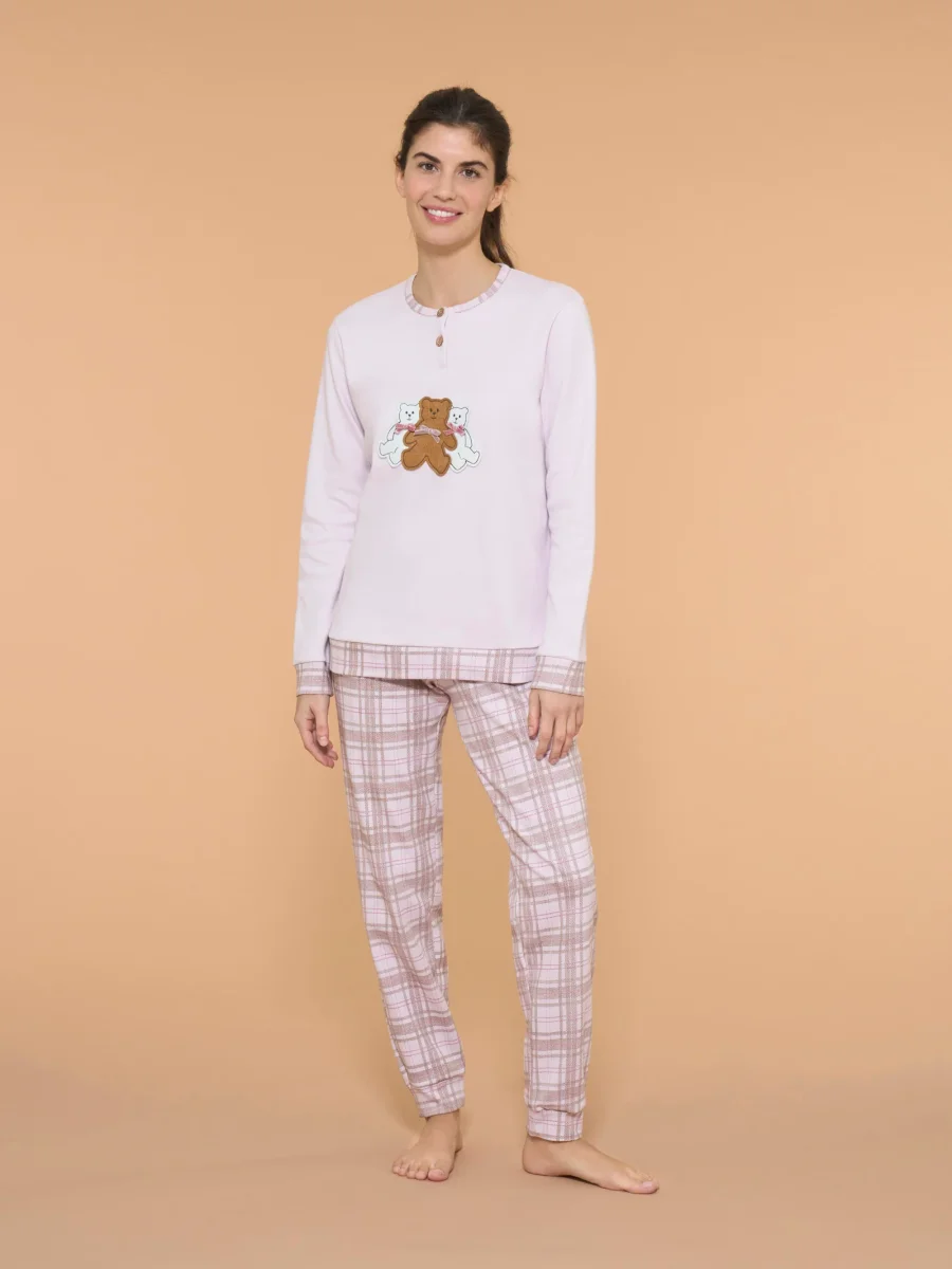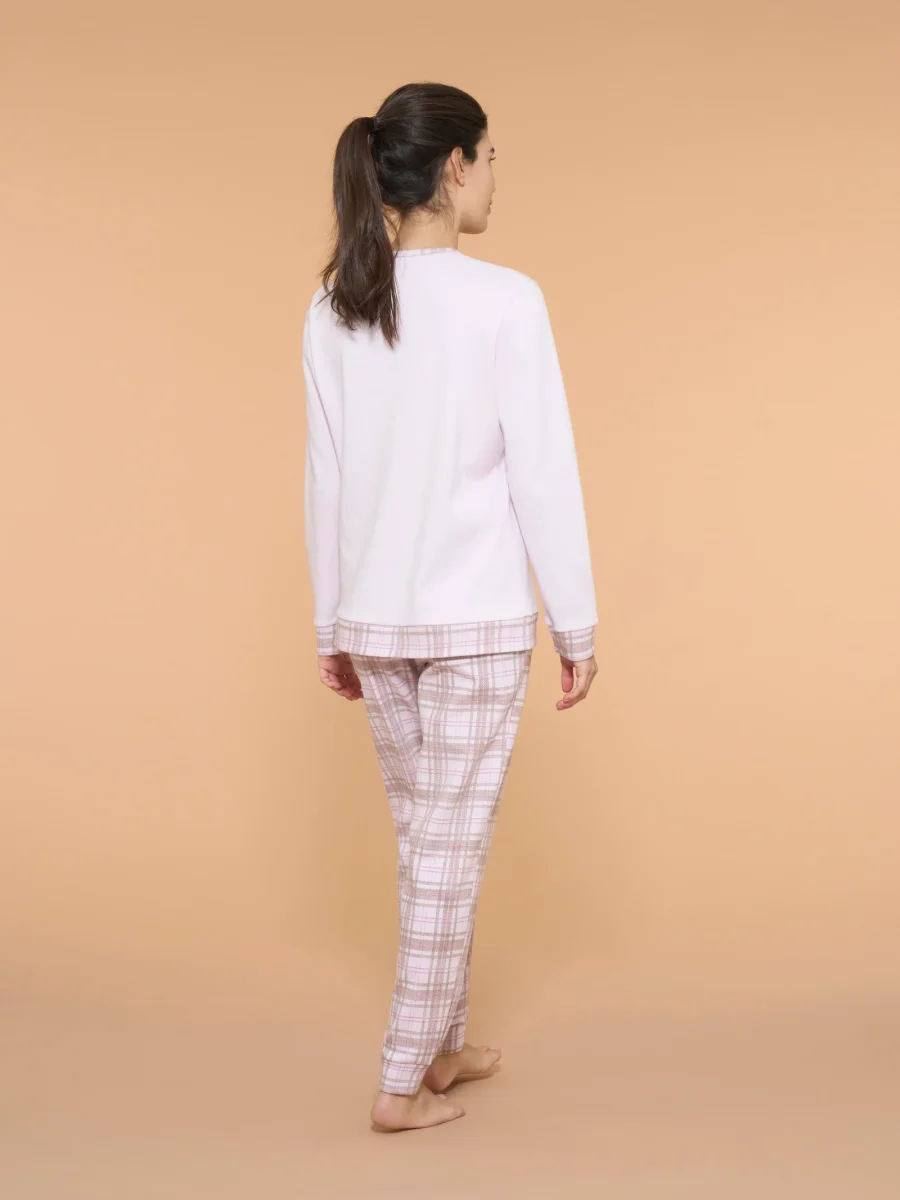 Pigiama serafino invernale da donna realizzato in interlock di caldo cotone, un tessuto che offre offre una piacevole sensazione di morbidezza e calore sulla pelle.