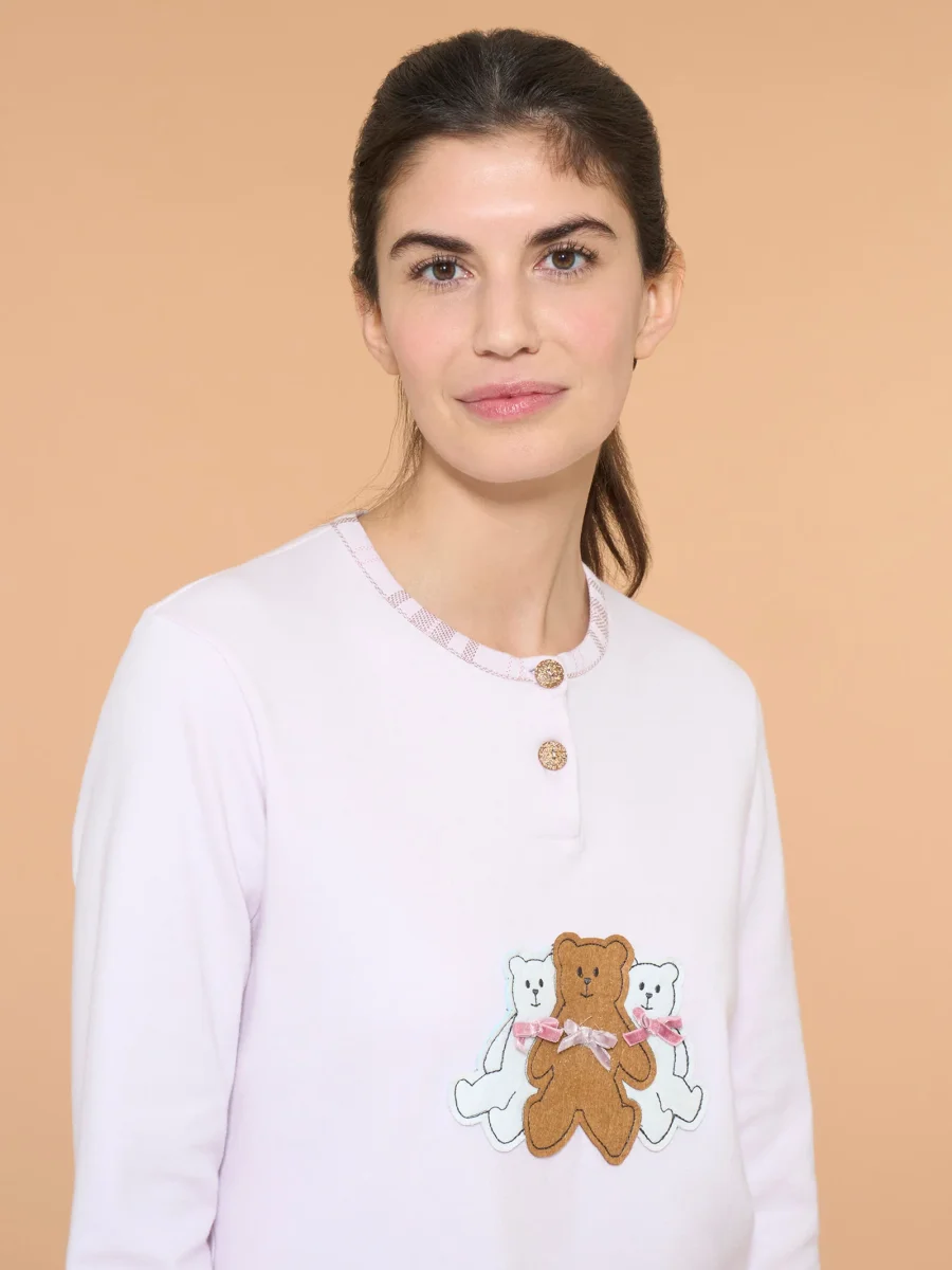 La casacca si presenta con una tonalità rosa ed è arricchita da un dettaglio simpatico composto da tre orsacchiotti, che aggiunge un tocco di dolcezza al capo.