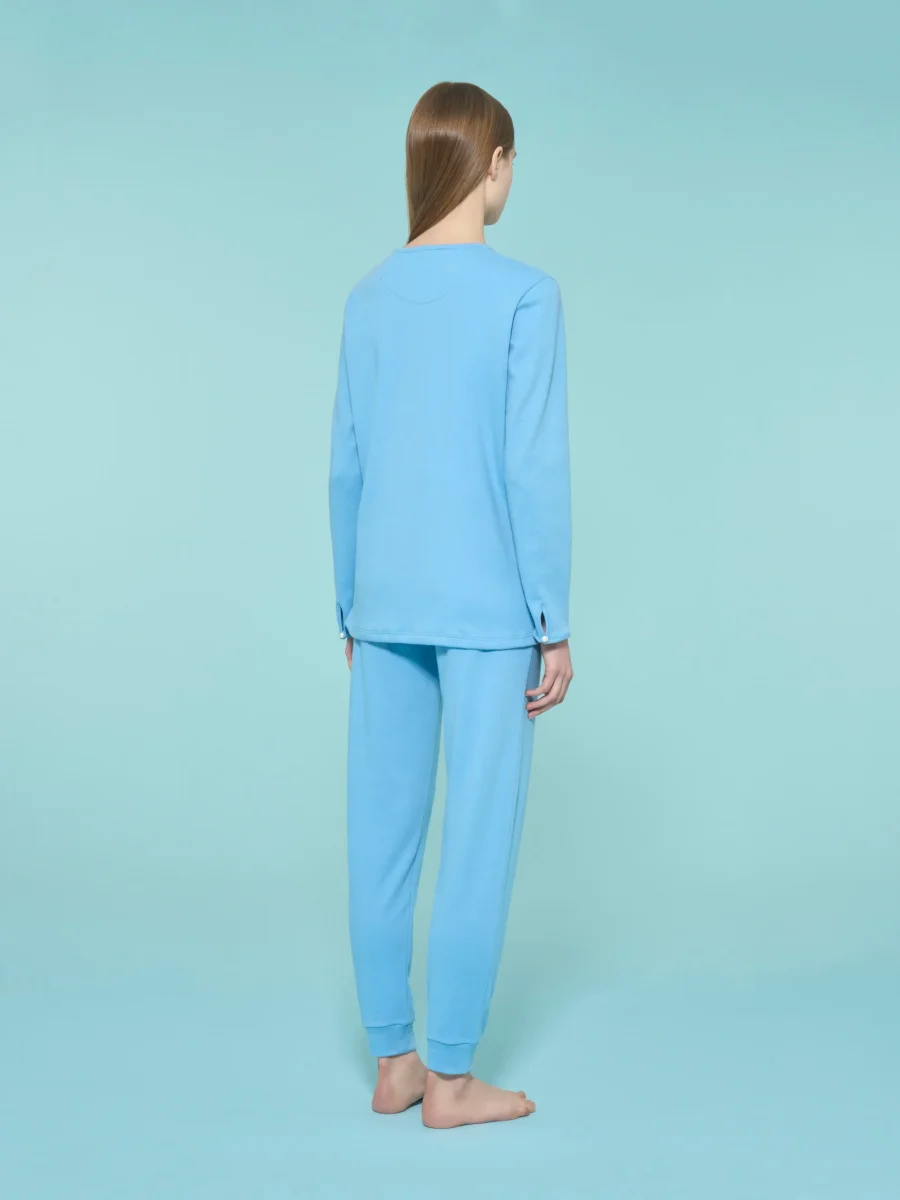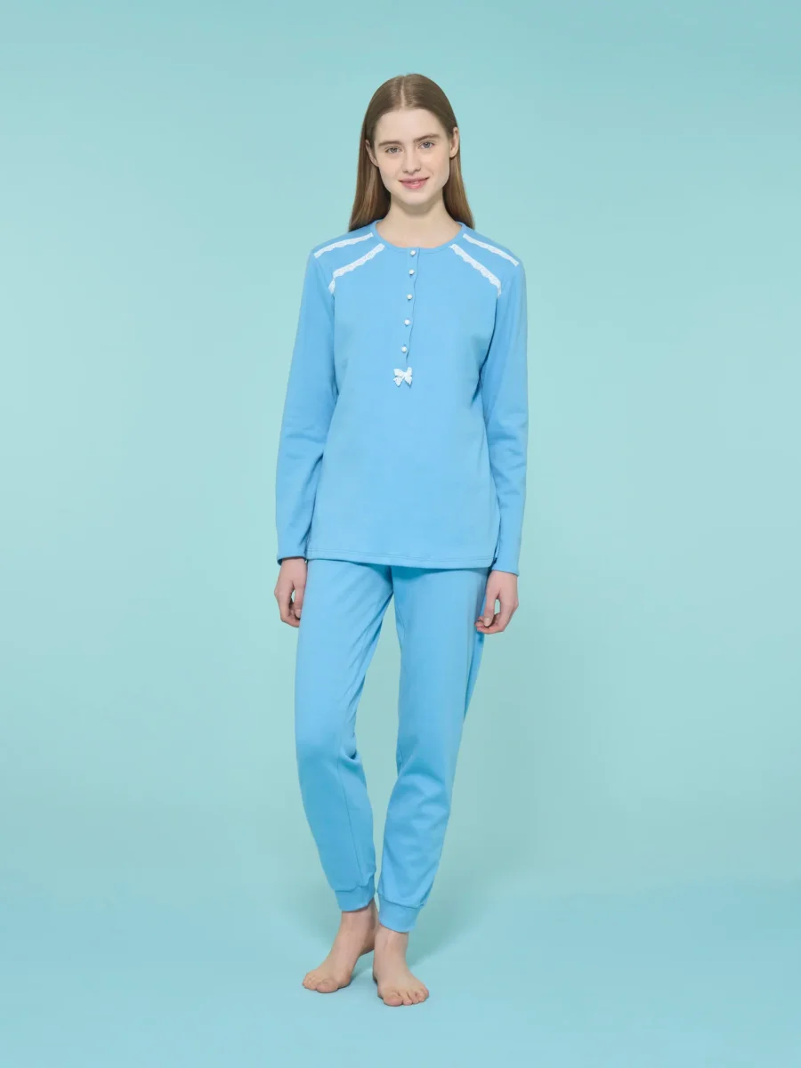 Immergerti in un universo di comfort con il pigiama da donna lungo in interlock di caldo cotone.