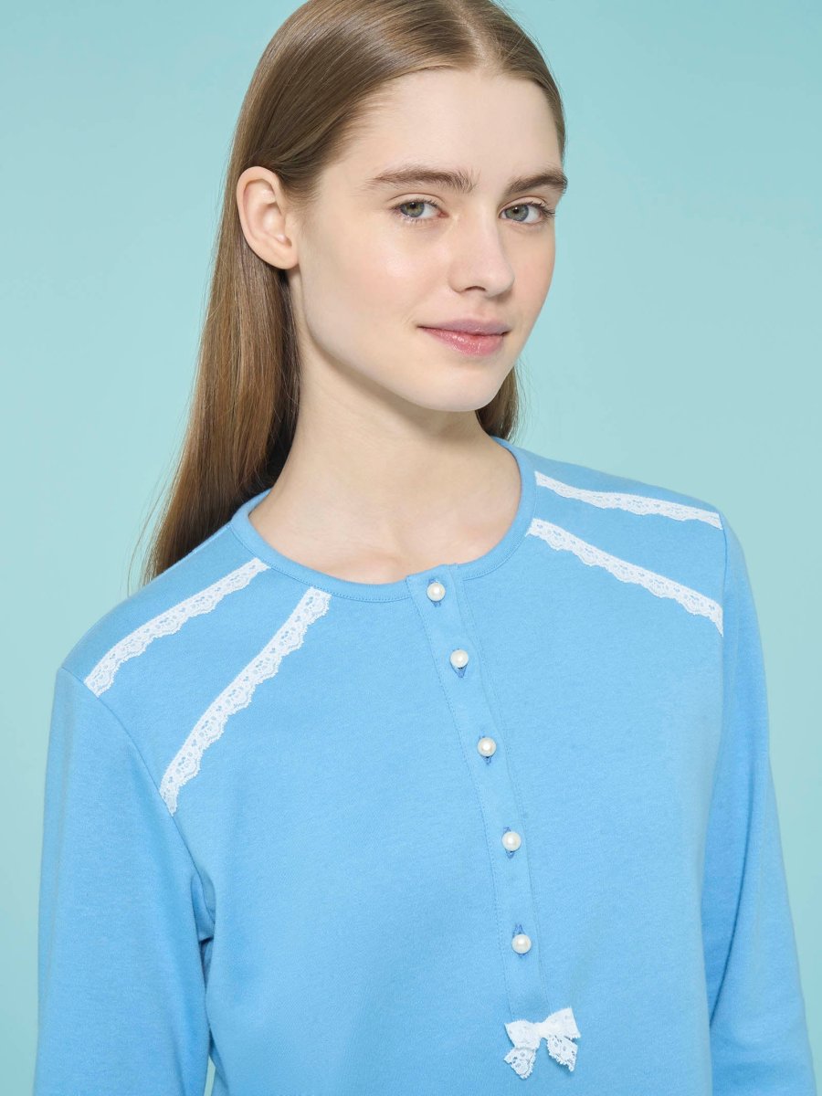 La casacca tinta unita con collo a serafino ha raffinate perline al posto dei classici bottoni, è adornata da un elegante fiocchetto sul collo e dal pizzo sulle spalle che si fondono armoniosamente sul morbido tessuto.