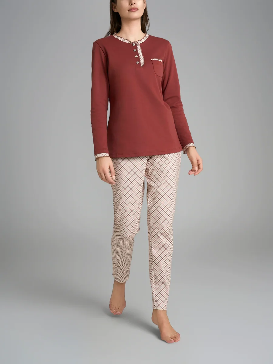 Realizzato in caldo cotone interlock, questo pigiama garantisce una piacevole sensazione di morbidezza e calore. Questo capo è il compagno ideale per accompagnarti con grazia e stile in ogni momento, che sia una tranquilla notte invernale o un’intera giornata a casa all’insegna del relax questo capo fa al caso tuo.
